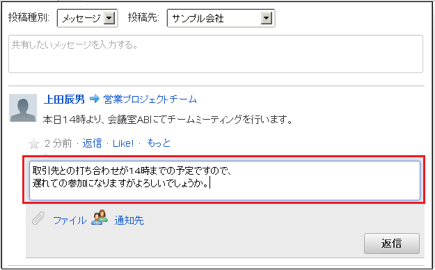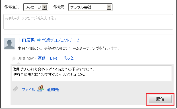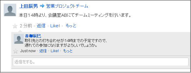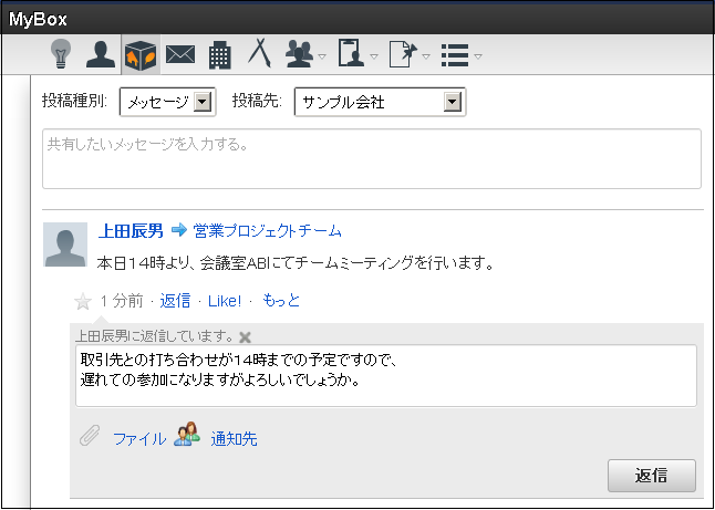IMBox メニューのMyBoxをクリックします。 返信メッセージを入力します。 「返信」をクリックします。 メッセージに返信することができました。 コラム 投稿されたメッセージの「返信」リンクをクリックしてから返信をすると、 どのユーザに向けて返信しているかを表示することができます。