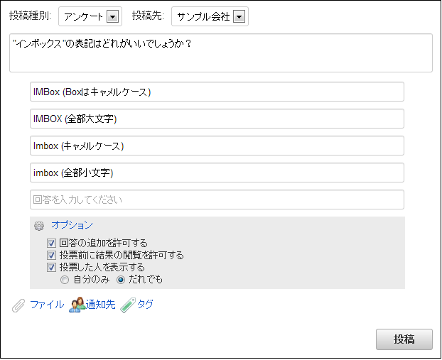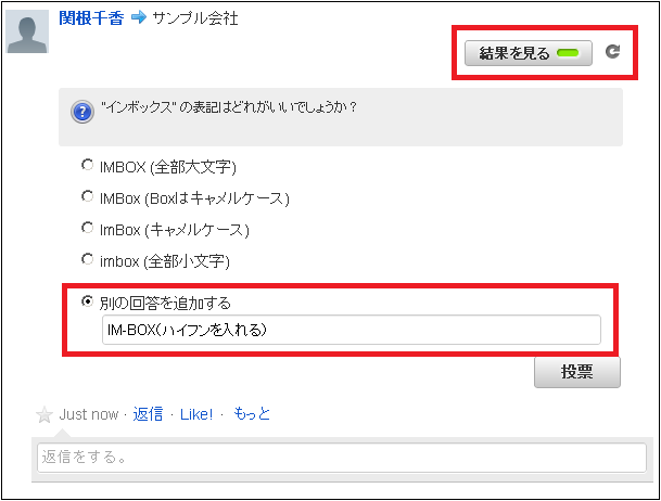 投稿時に「回答の追加を許可する」のチェックボックスをオンにすると、他ユーザでも別の回答を追加可能です。投稿時に「投票前に結果の閲覧を許可する」のチェックボックスをオンにすると、投票を行ってないユーザでも結果のみが表示可能です。投稿時に「投票した人を表示する」のチェックボックスをオンにすると、回答毎に投票した人の一覧が表示可能です。回答の追加が許可されていると、投稿者でなくても別の回答を追加することができます。投票していない場合でも結果の閲覧が許可されていると、投票を行ってない場合でも、「結果をみる」ボタンが表示されます。投票した人の表示が可能となっている場合、回答毎に投票者一覧表示アイコンが表示されます。