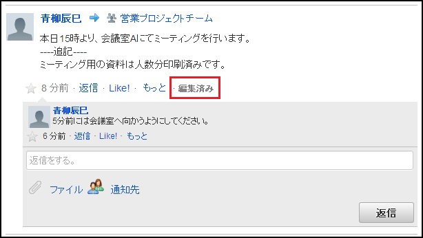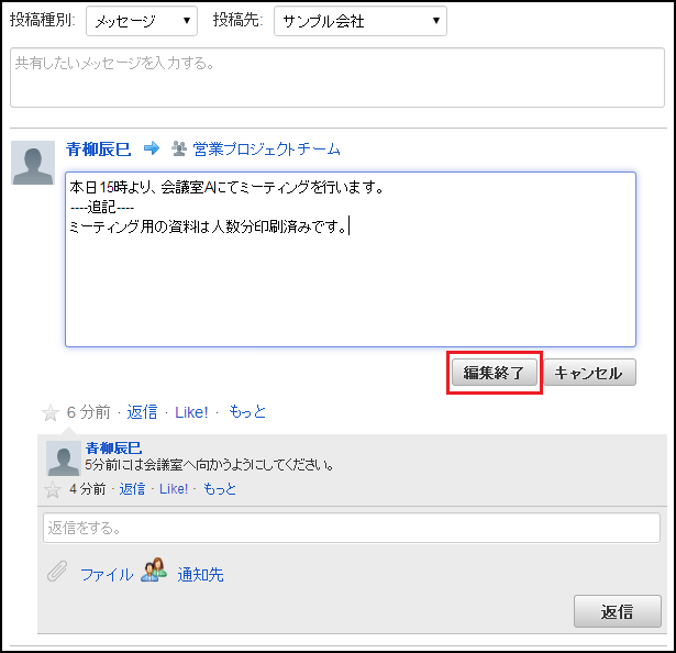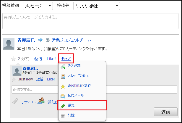 自分が投稿したメッセージの「もっと」メニューから、「編集」をクリックします。