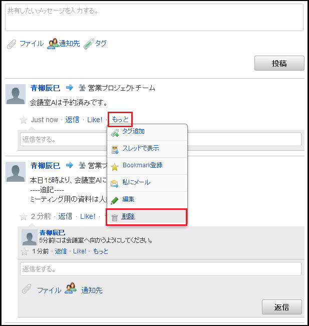 自分が投稿したメッセージの「もっと」メニューから、「削除」をクリックします。
