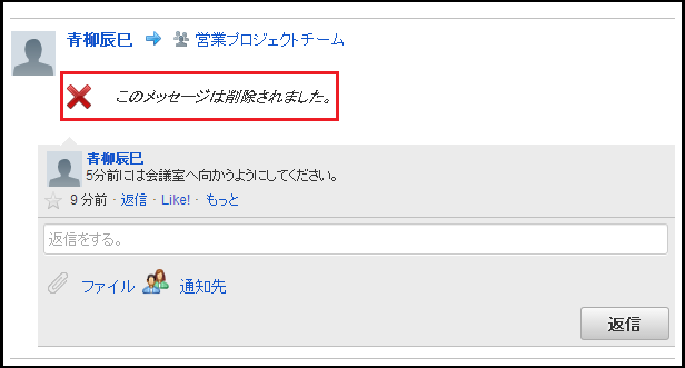 メッセージ削除権限を保持している場合、全てのメッセージの削除が行えます。グループへの投稿の場合、グループオーナーはグループ内の全てのメッセージの削除が行えます。削除機能の詳細については「IMBox仕様書 - Box共通仕様 - アクション」を参考にしてください。