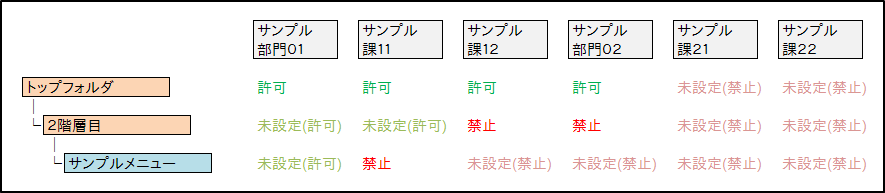 親の権限 自身の権限 設定される権限 あり あり 未設定(許可) あり なし 禁止 なし あり 未設定(禁止) なし なし 未設定(禁止) 注意