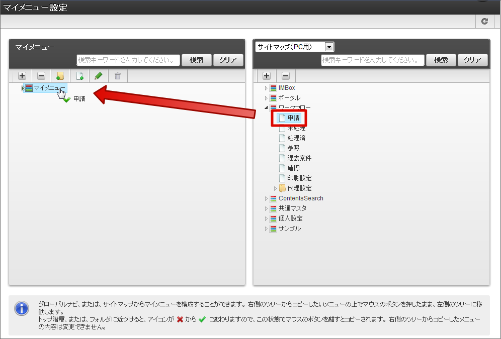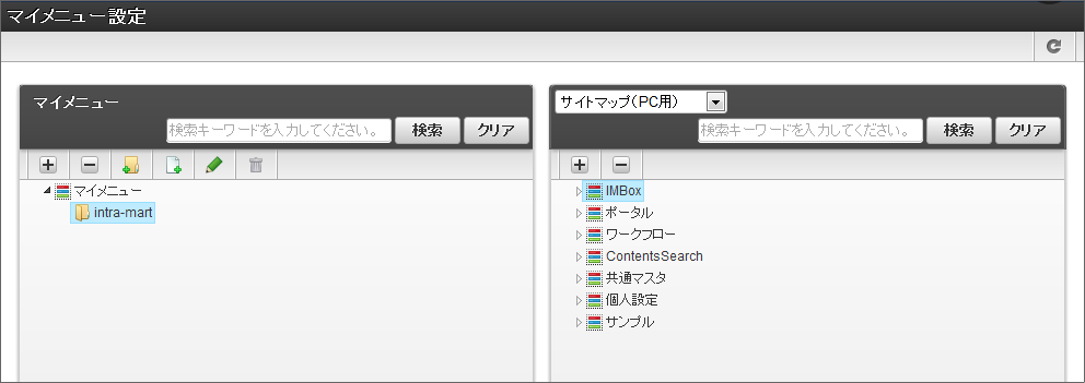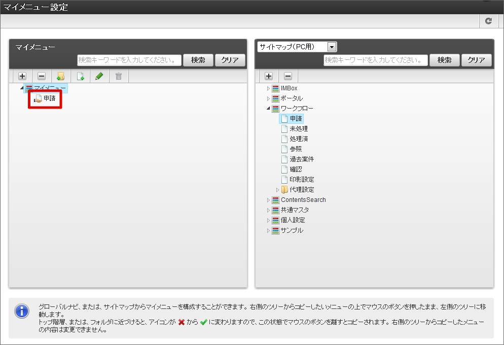 ログインユーザごとにオリジナルメニューを作成できる機能です。ログインユーザ自身でサービスの登録をおこないます。