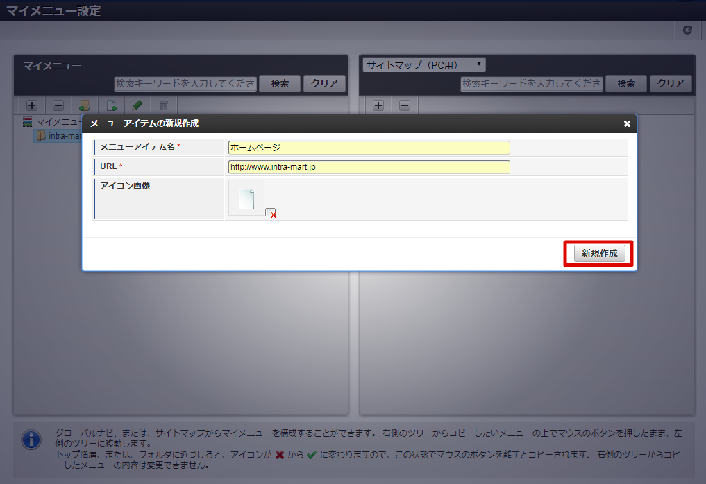 「メニューアイテムの新規作成」画面が表示されます。