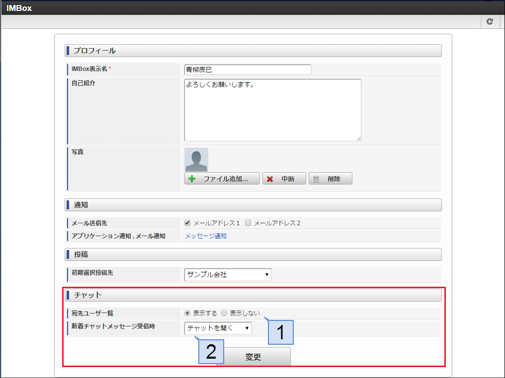 IMBox管理者によりチャット機能の利用を無効化されている場合、この項目は表示されません。チャット機能の管理者権限に関しての詳細は、「 IMBox 管理者操作ガイド 」-「 チャット 」を参照してください。