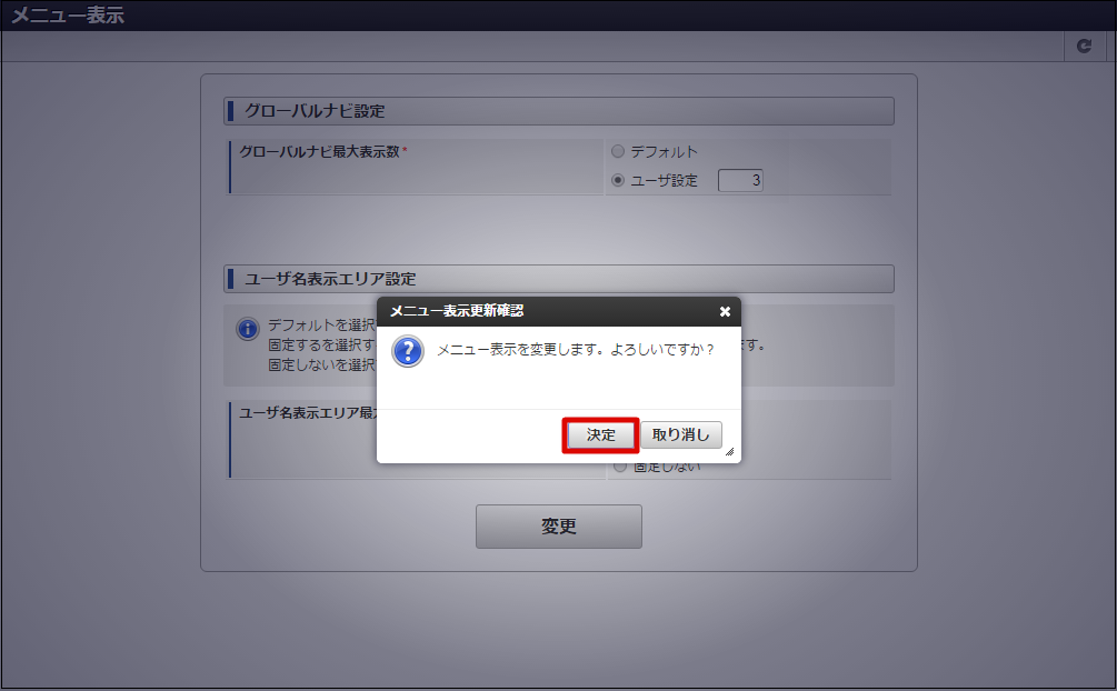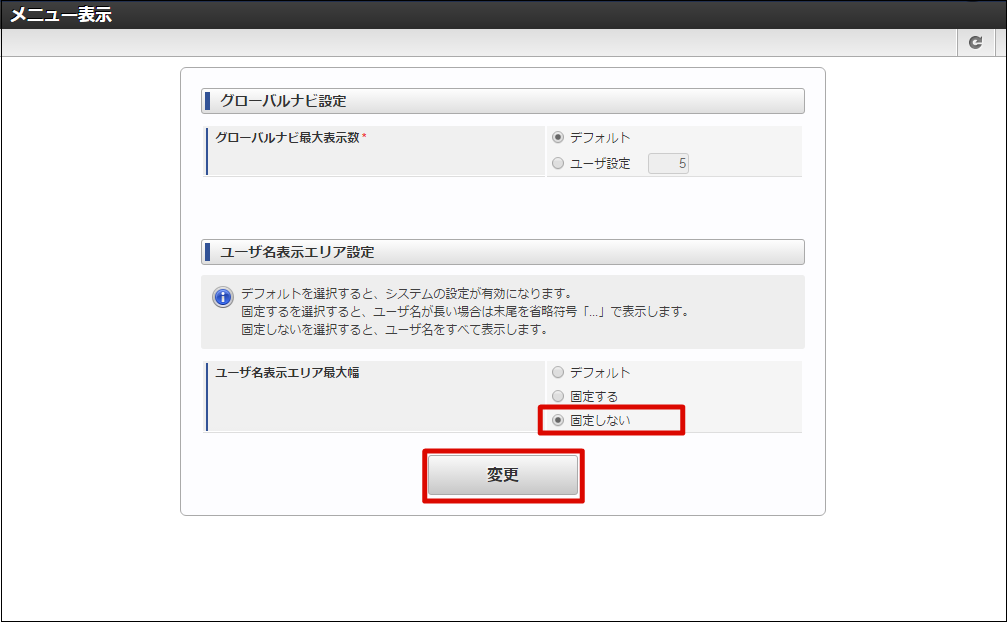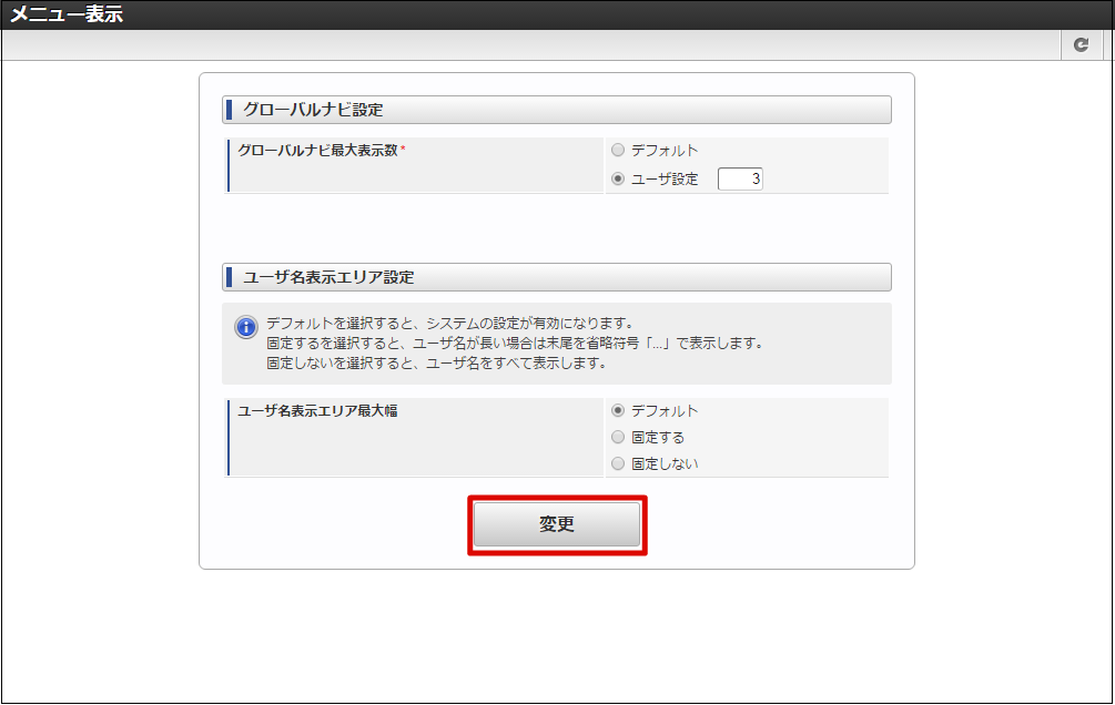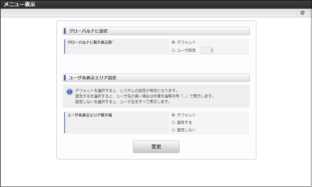 グローバルナビやユーザ名表示エリア(ユーティリティメニュー)等の、メニューに対する表示設定を行うことができます。