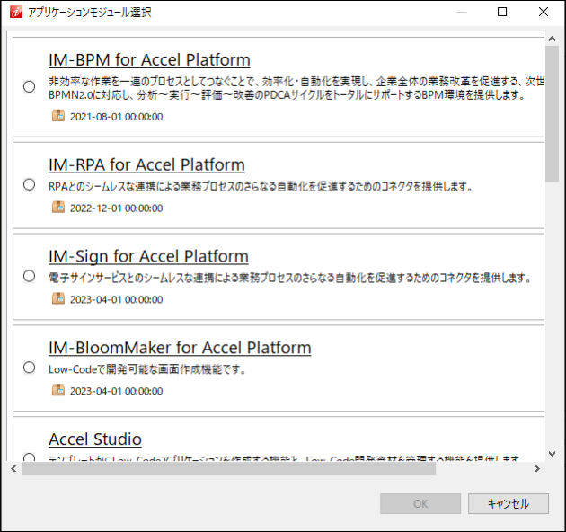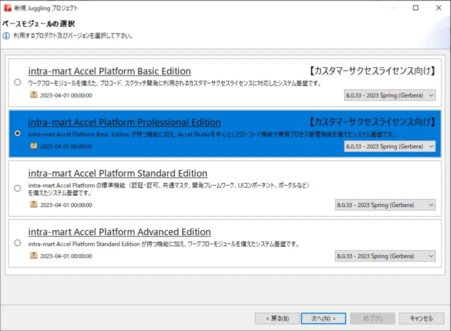 同一プロダクトにおいて複数のバージョンが表示されている場合は最新のものを選択する事を推奨します。 利用するアプリケーションを選択します。選択後、「次へ(N)」をクリックします。 利用するプラットフォーム用の追加リソース(設定ファイル等)を選択する画面が表示されますが、変更しないまま、「次へ(N)」をクリックします。最後に「終了(F)」をクリックします。
