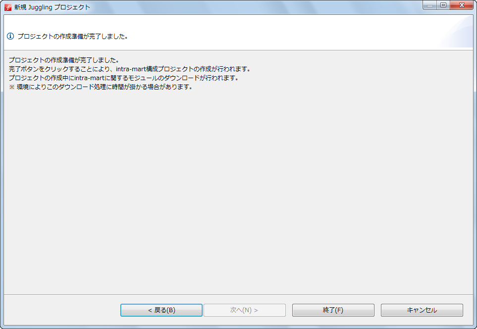 初回起動時の場合、「使用許諾契約書の同意」が表示されます。「同意する」を選択し「OK」をクリックします。 ダッシュボードが表示されます。「プロジェクトを新規に作成する」を選択します。 ポップアップ表示されたウィザード画面内の「プロジェクト名」に半角英数字の任意のプロジェクト名を入力します。入力後、「次へ(N)」 をクリックします。 利用するプロダクトおよびバージョンを選択します。選択後、「次へ(N)」をクリックします。コラム