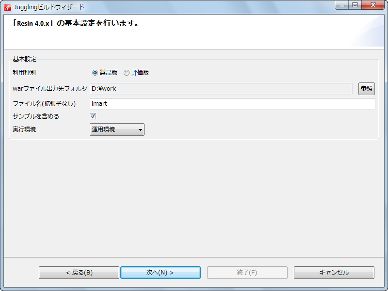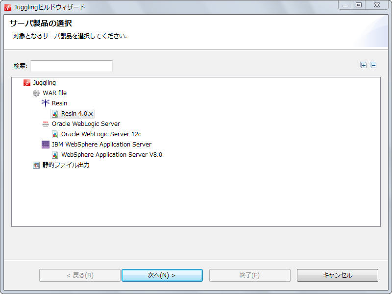 「ライセンスのレビュー」画面で内容を確認し、同意頂ける場合は「使用条件の条項に同意します。」を選択し、「次へ」をクリックします。 「設定項目の確認」画面で内容を確認し、「終了」をクリックします。Jugglingビルドウィザード画面が立ち上がり、ダウンロードが開始されます。ダウンロードに時間がかかりますので、完了するまで操作を行わないでください。 WARファイルが指定の場所に出力されると、ビルドウィザード画面が閉じます。指定したディレクトリにWARファイルが出力されます。