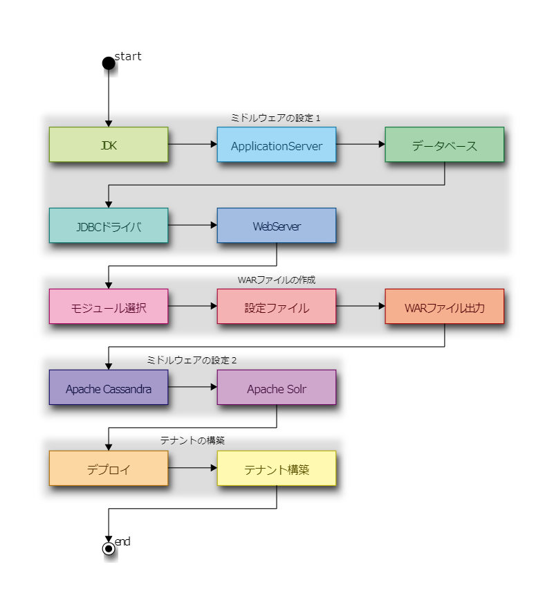 Name Description start JDK JDK データベース データベース JDBCドライバ JDBCドライバ ApplicationServer Web Application Server WebServer Web Server モジュール選択 WARファイルの作成 - プロジェクトの作成とモジュールの選択 設定ファイル WARファイルの作成 - 全文検索機能(IM-ContentsSearch)の設定 WARファイル出力 WARファイルの作成 - WARファイルの出力 Apache Cassandra Apache Cassandra Apache Solr Apache Solr デプロイ デプロイ テナント構築 テナント環境セットアップ end