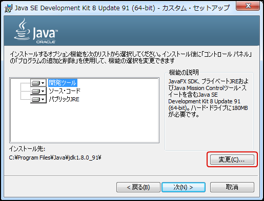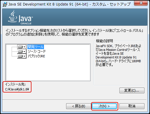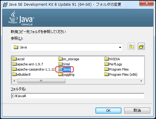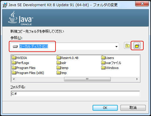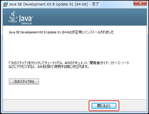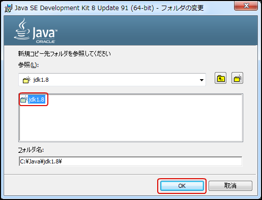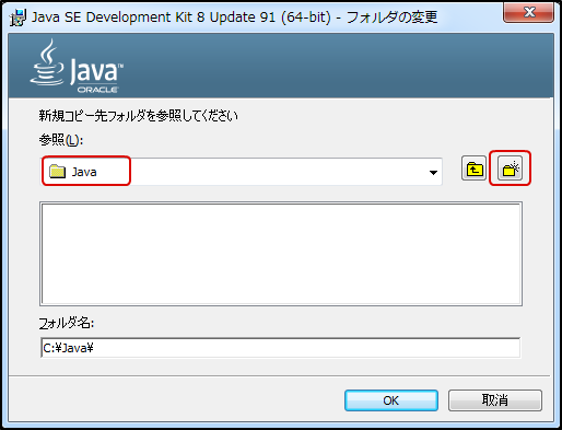 ダウンロードしたexeファイルをダブルクリックします。 以下の画面が表示されるまで「次へ」をクリックします。「変更」をクリックします。 「ローカルディスク」を選択します。 「ローカルディスク」を選択していることを確認し、「新しいフォルダーの作成」アイコンをクリックします。 新しいフォルダー名に「Java」と入力します。 「Java」が選択されていることを確認し、もう一度「新しいフォルダーの作成」アイコンをクリックします。 「jdk1.8」と入力し、「OK」をクリックします。 インストール先が作成したフォルダーのパスに変更されていることを確認し、「次へ」をクリックします。 「次へ」をクリックします。 「閉じる」をクリックします。 JDK のインストールは完了です。
