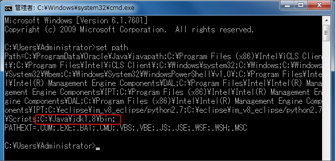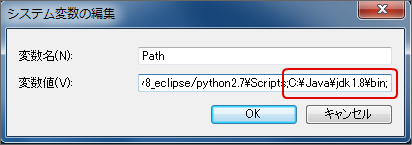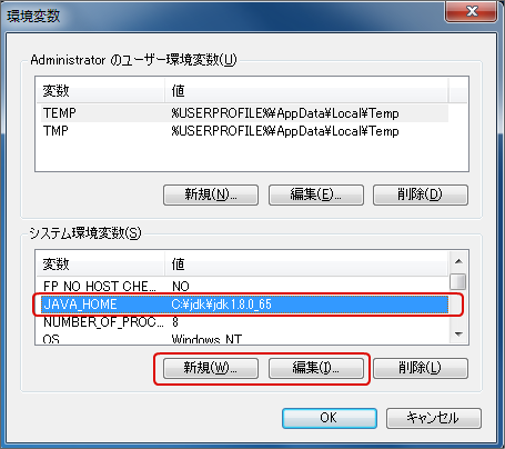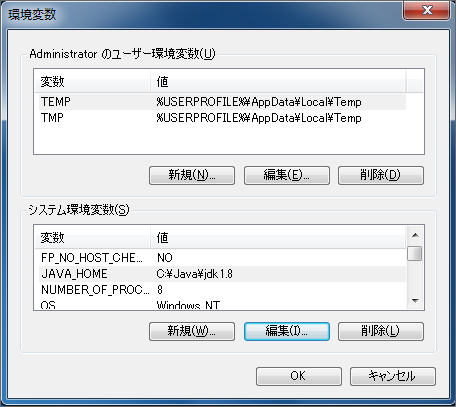 「環境変数」をクリックします。 「システム環境変数」の変数「Path」を選択し、「編集」をクリックします。 「変数値」の最後に JDK をインストールしたホームディレクトリ内の「bin」ディレクトリパスを入力し、「OK」をクリックします。 「システム環境変数」の変数「JAVA_HOME」を選択し、「編集」をクリックします。「JAVA_HOME」がない場合は、「新規」をクリックします。 新規の場合は、「変数名」に「JAVA_HOME」と入力します。「変数値」に JDK をインストールしたホームディレクトリパスを入力し、「OK」をクリックします。 「OK」をクリックします。環境変数の設定は完了です。