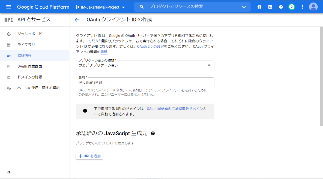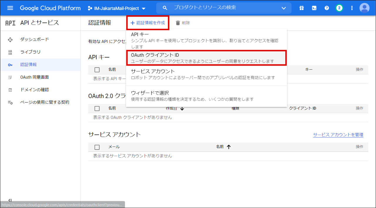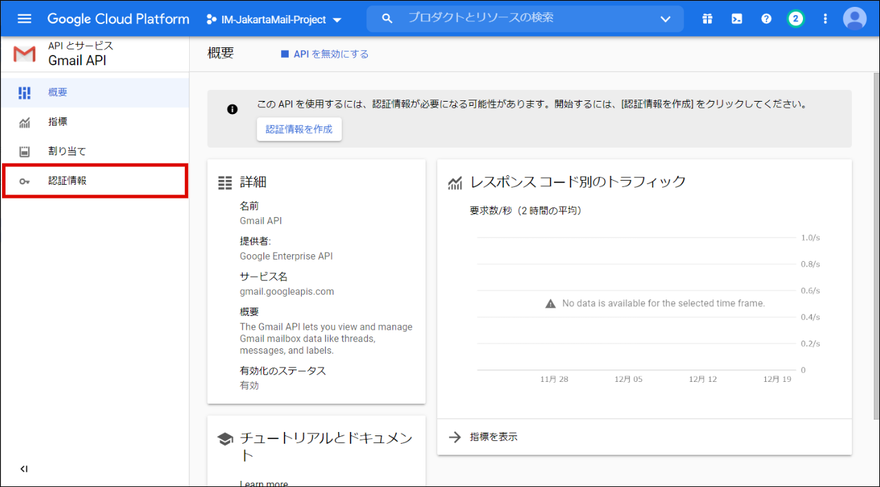 サイドメニューから「認証情報」をクリックします。