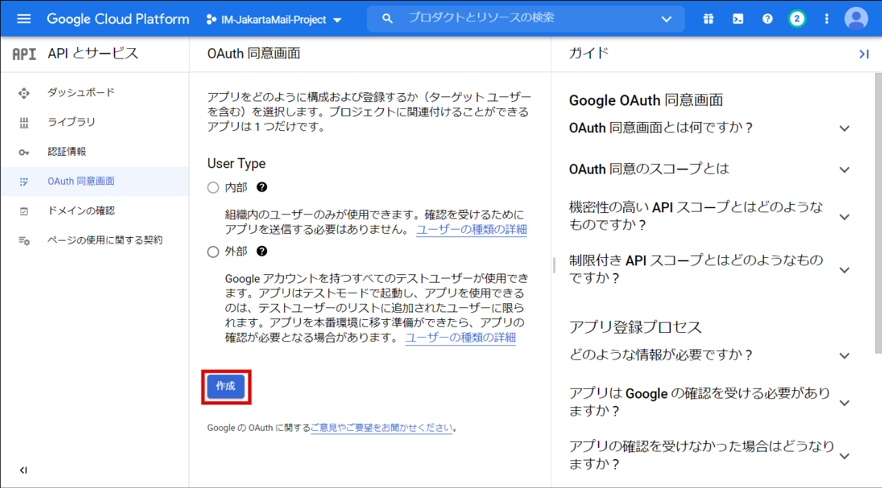 任意の「User Type」を選択し、「作成」をクリックします。