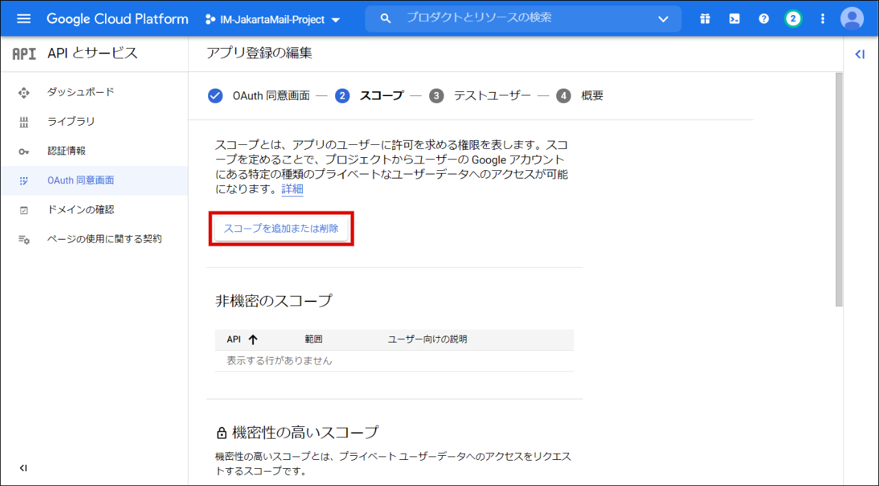 「スコープを追加または削除」をクリックし、 Gmail API をスコープに追加します。利用用途にあわせてスコープを選択してください。スコープを追加したら、「保存して次へ」をクリックします。