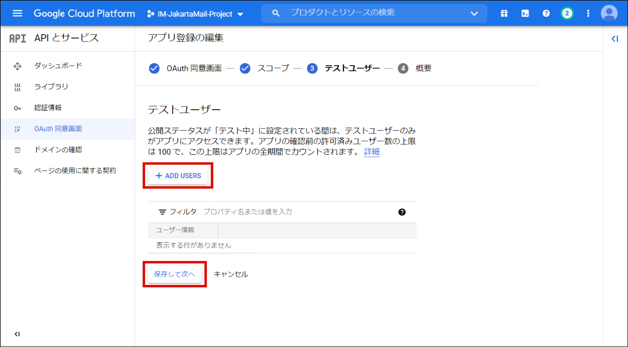 「ADD USERS」をクリックし接続テストを行うユーザを追加し、「保存して次へ」をクリックします。以上で、OAuth 同意画面の設定は完了です。次に OAuth クライアントID を作成します。