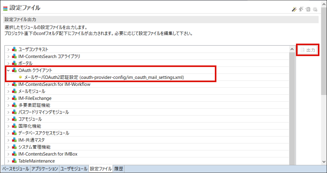 「設定ファイル」タブを開き、「 OAuth クライアント 」 - 「メールサーバOAuth2認証設定」を選択して「出力」ボタンをクリックします。