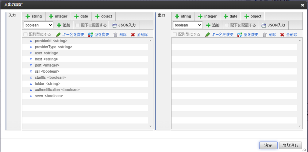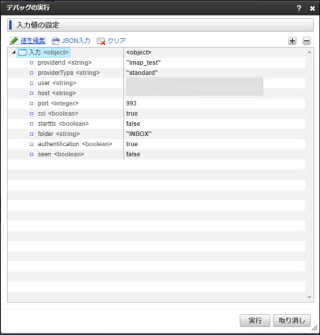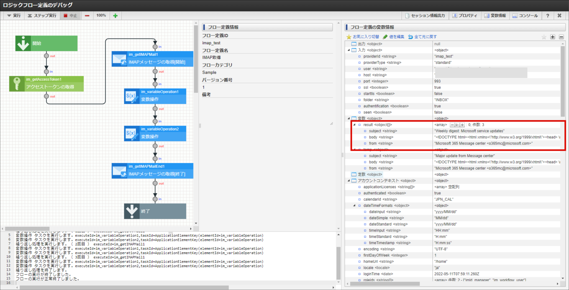 providerId 「プロバイダ情報を設定する」で設定した id を設定します。 providerType 「プロバイダ情報を設定する」で設定した provider-type を設定します。 authentification true を設定します。 user 「連携許可を行う」でサインインしたユーザを設定します 。 folder IMAPメッセージの取得タスク の folder から目的に合った値を設定します。 seen IMAPメッセージの取得タスク の seen から目的に合った値を設定します。 host サービスのIMAP設定に合わせて設定します。Gmail Check Gmail through other email platforms を参照してください。Exchange Online POP3 と IMAP4 を参照してください。port サービスのIMAP設定に合わせて設定します。Gmail Check Gmail through other email platforms を参照してください。Exchange Online POP3 と IMAP4 を参照してください。ssl サービスのIMAP設定に合わせて設定します。Gmail Check Gmail through other email platforms を参照してください。Exchange Online POP3 と IMAP4 を参照してください。starttls サービスのIMAP設定に合わせて設定します。Gmail Check Gmail through other email platforms を参照してください。Exchange Online POP3 と IMAP4 を参照してください。終了後、変数「result」にメッセージが格納できれば成功です。