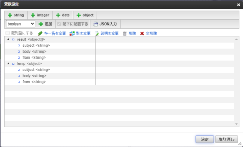 - IMAPメッセージの取得タスクの返却値を格納する変数を変数設定で定義しています。