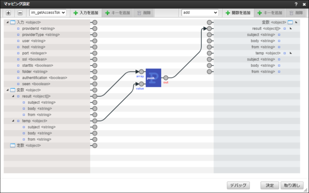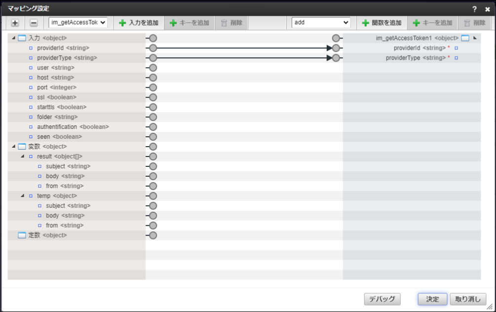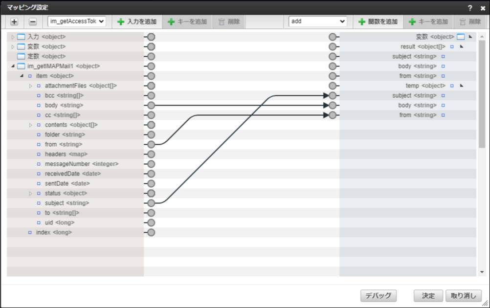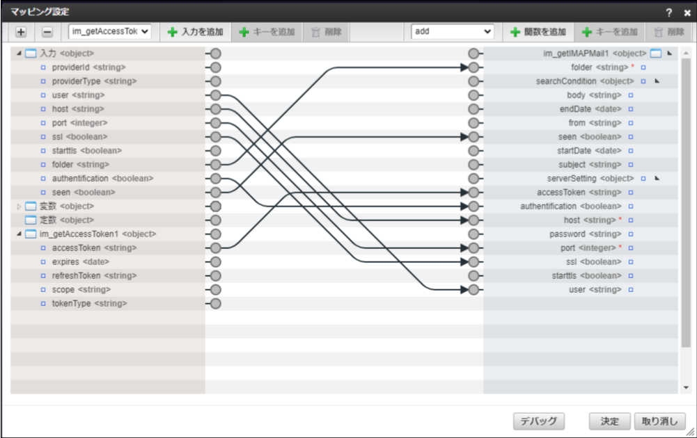 - IMAPメッセージの取得タスクのマッピングで、アクセストークンの取得タスクの返却値と、入力値を渡しています。