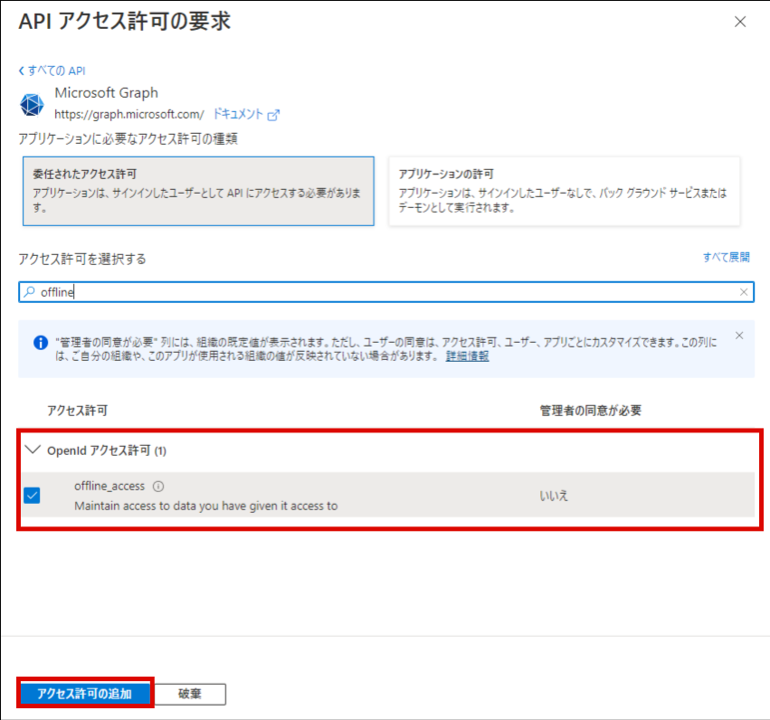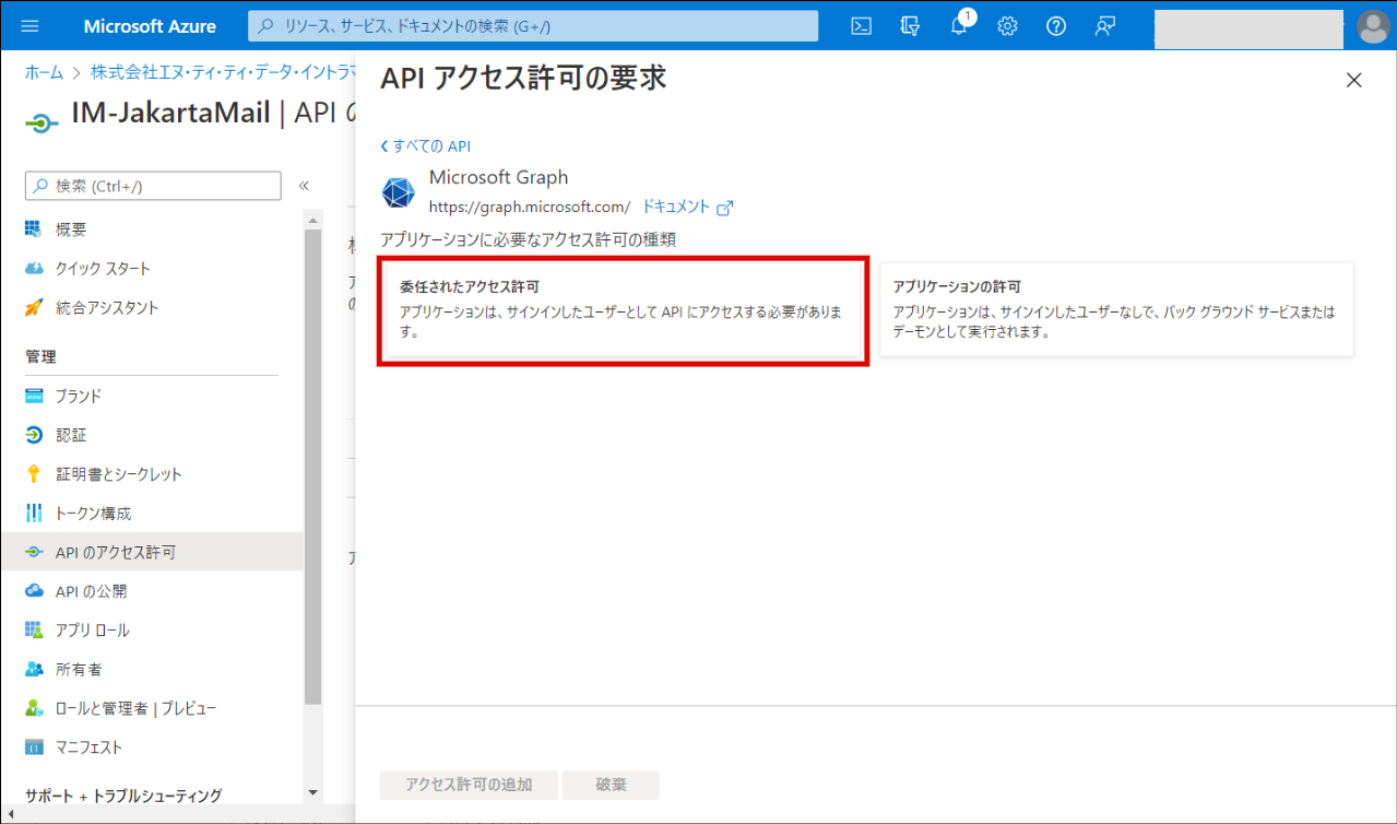 「アプリケーションに必要なアクセス許可の種類」の「委任されたアクセス許可」をクリックします。