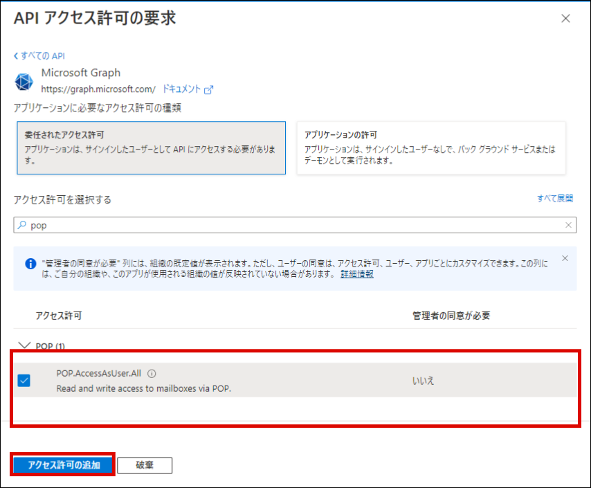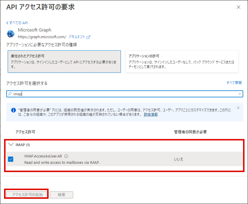 offline_access と、利用用途にあわせ IMAP.AccessAsUser.All または POP.AccessAsUser.All を選択し、「アクセス許可の追加」をクリックします。