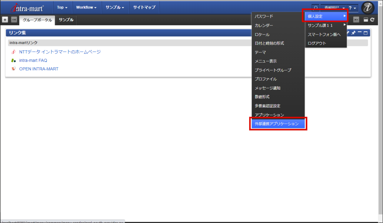 ユーティリティメニューより、「個人設定」-「外部連携アプリケーション」を選択します。