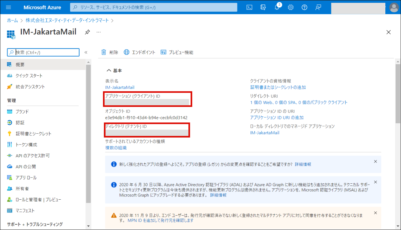oauth-provider@id 任意のIDを設定します。 authz-end-point Microsoft Azure で作成したアプリケーションのディレクトリIDを設定します。 token-end-point Microsoft Azure で作成したアプリケーションのディレクトリIDを設定します。 client-id Microsoft Azure で作成したアプリケーションのアプリケーションIDを設定します。 client-secret Microsoft Azure で作成したアプリケーションの認証情報のクライアントシークレット値を設定します。 scope 利用用途にあわせて設定します。詳しくは アクセス許可のスコープの文字列 を参照してください。セットアップ時の設定は以上です。