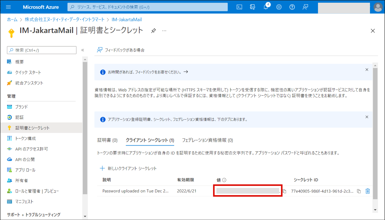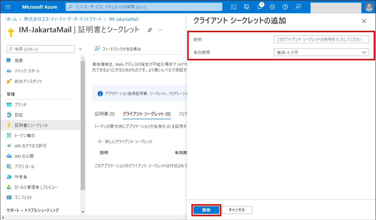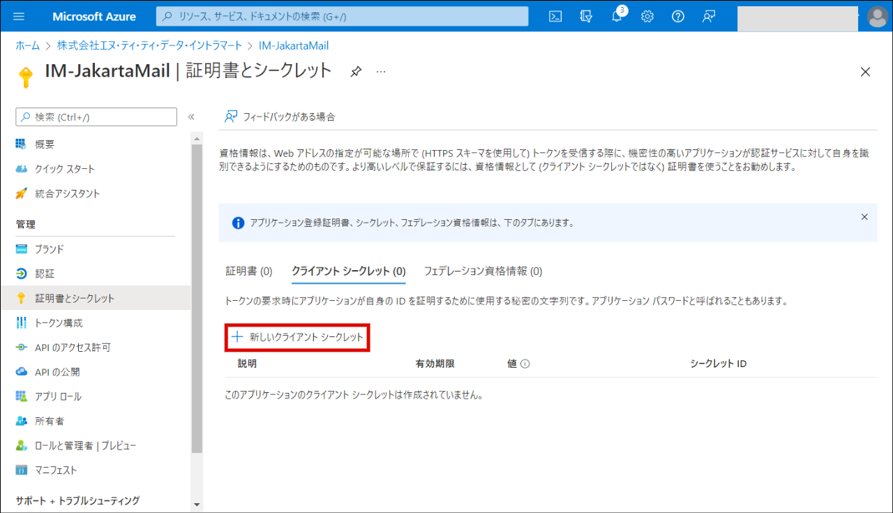 「クライアント シークレット」の「新しいクライアント シークレット」をクリックします。