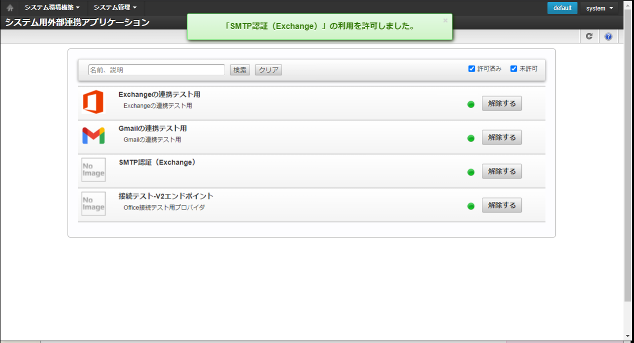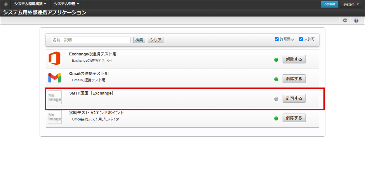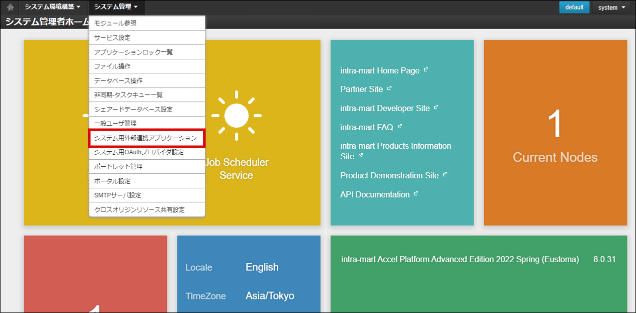 「システム管理」→「システム用外部連携アプリケーション」に遷移します。