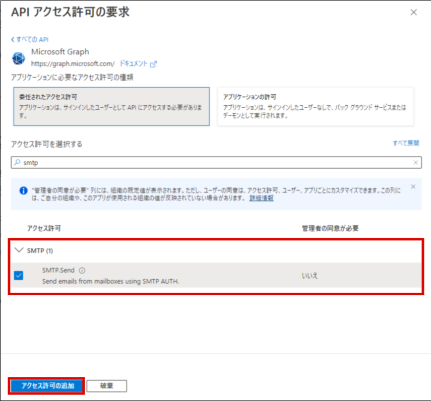 「SMTP.Send」、「offline_access」を選択し、「アクセス許可の追加」をクリックします。