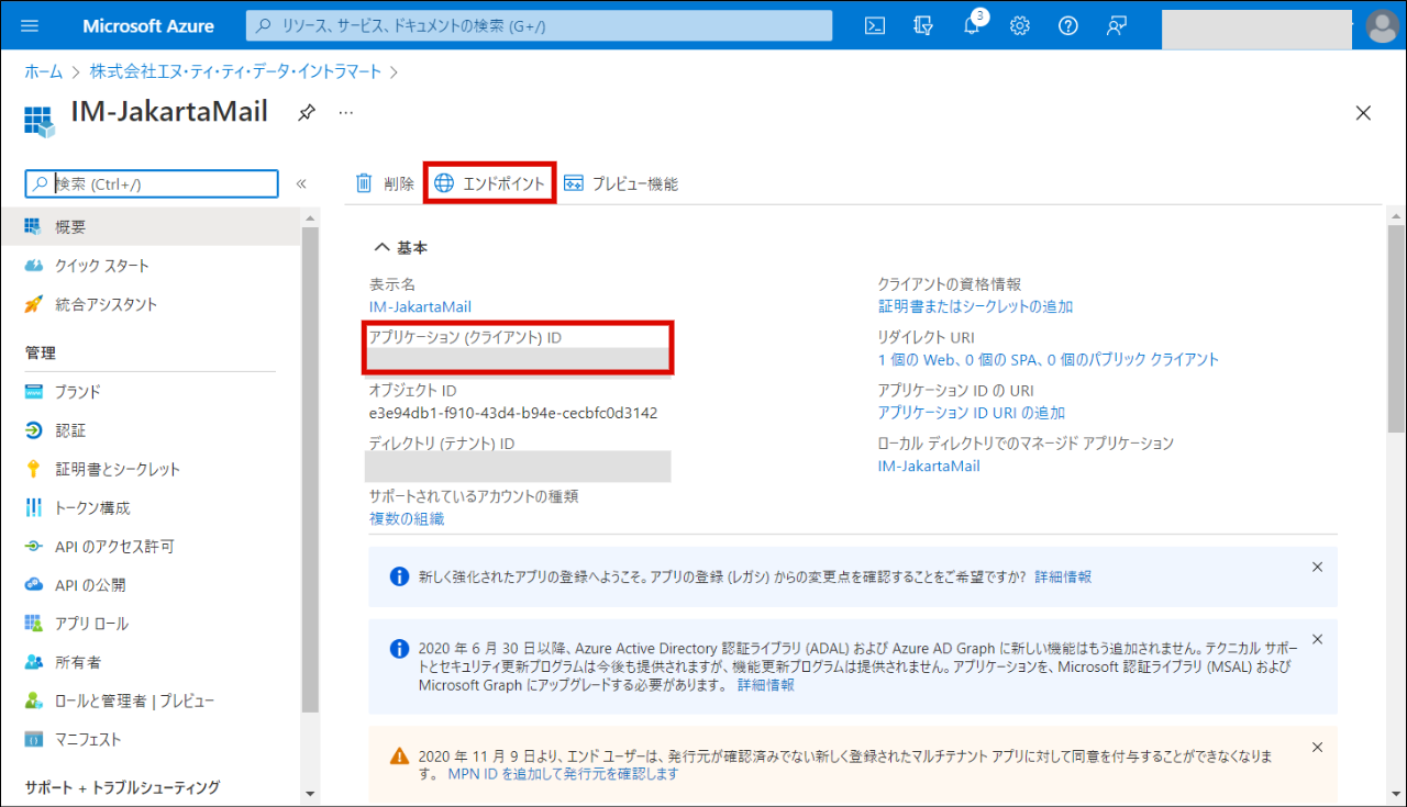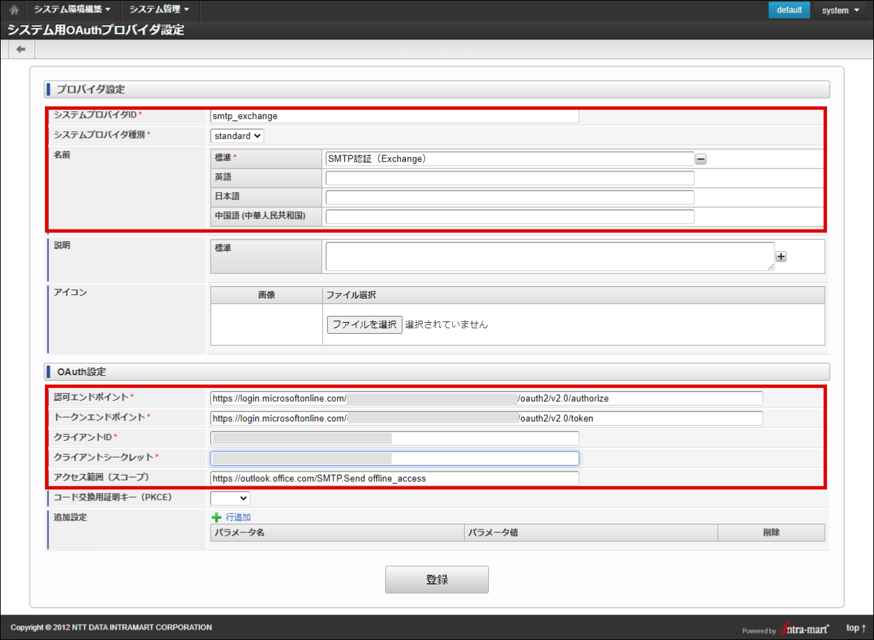 システムプロバイダID 任意のIDを設定します。 システムプロバイダ種別 standard を設定します。 名前 任意の名前を設定します。 認可エンドポイント Microsoft Azure で作成したアプリケーションのOAuth 2.0 承認エンドポイント (v2)を設定します。 トークンエンドポイント Microsoft Azure で作成したアプリケーションのOAuth 2.0 トークン エンドポイント (v2)を設定します。 クライアントID Microsoft Azure で作成したアプリケーションのアプリケーションIDを設定します。 クライアントシークレット Microsoft Azure で作成したアプリケーションの認証情報のクライアントシークレット値を設定します。 アクセス範囲 SMTP AUTHスコープと offline_access を半角スペース区切りで設定します。詳しくは アクセス許可のスコープの文字列 を参照してください。以上でプロバイダ情報の設定が完了です。