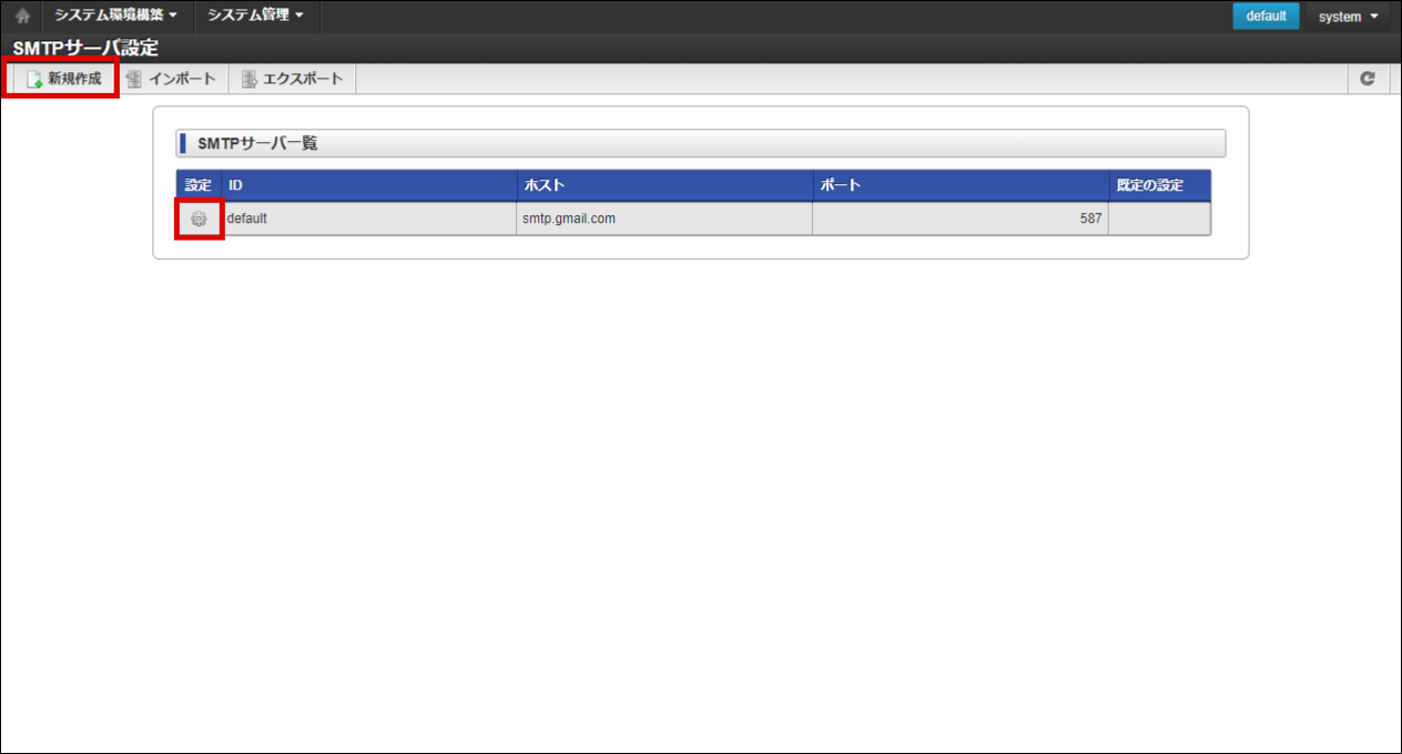 対象のテナントIDがない場合は、IDが default のSMTPサーバ設定が適用されています。 「新規作成」をクリックして対象のテナントIDで新規作成するか、 default の「設定」をクリックして編集画面に遷移してください。