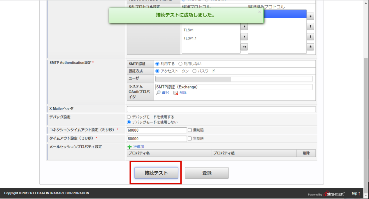 Exchange Online の設定値 (リンク先は2022年6月1日 時点で情報を確認しています。)「接続テスト」をクリックし、以下の画面が表示されればSMTPサーバとの接続が成功です。