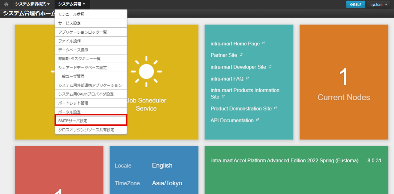 画面でSMTPサーバ設定を行う「システム管理者操作ガイド」 - 「SMTPサーバ設定」 設定ファイルでSMTPサーバ設定を行う「設定ファイルリファレンス」 - 「メール設定」