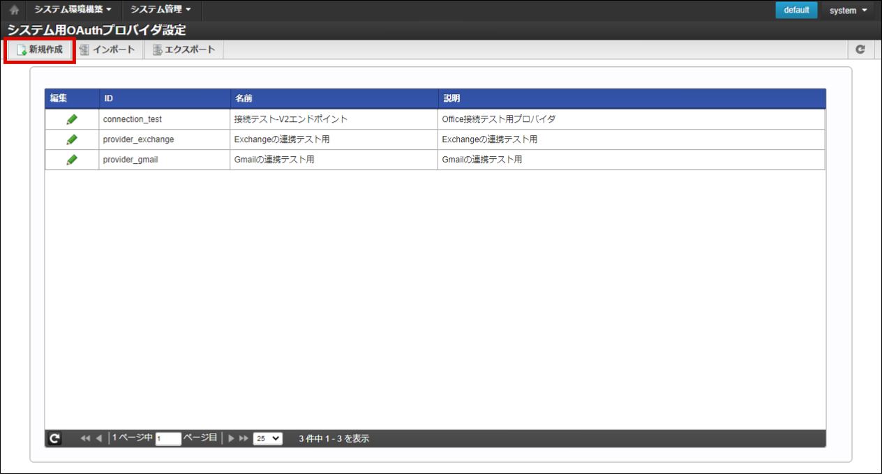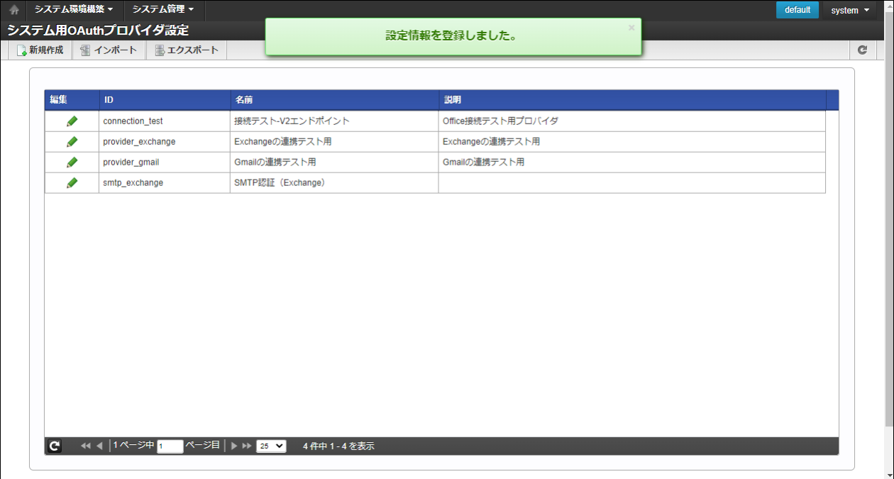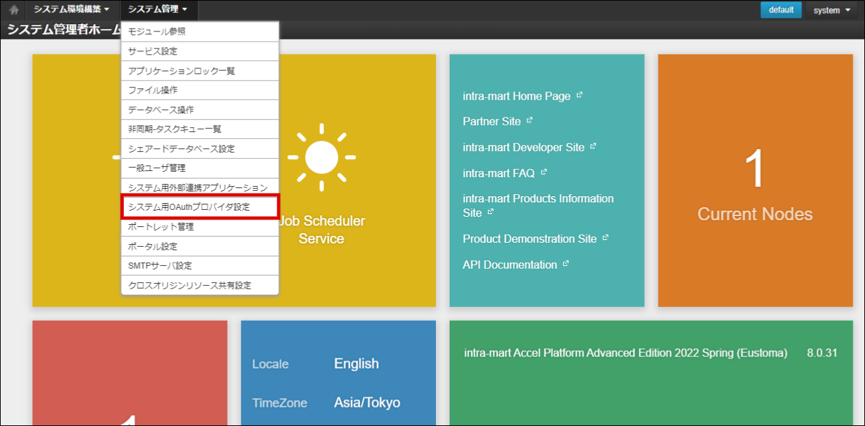 「システム管理者画面」 にログインし、「システム管理」→「システム用OAuthプロバイダ設定」に遷移します。