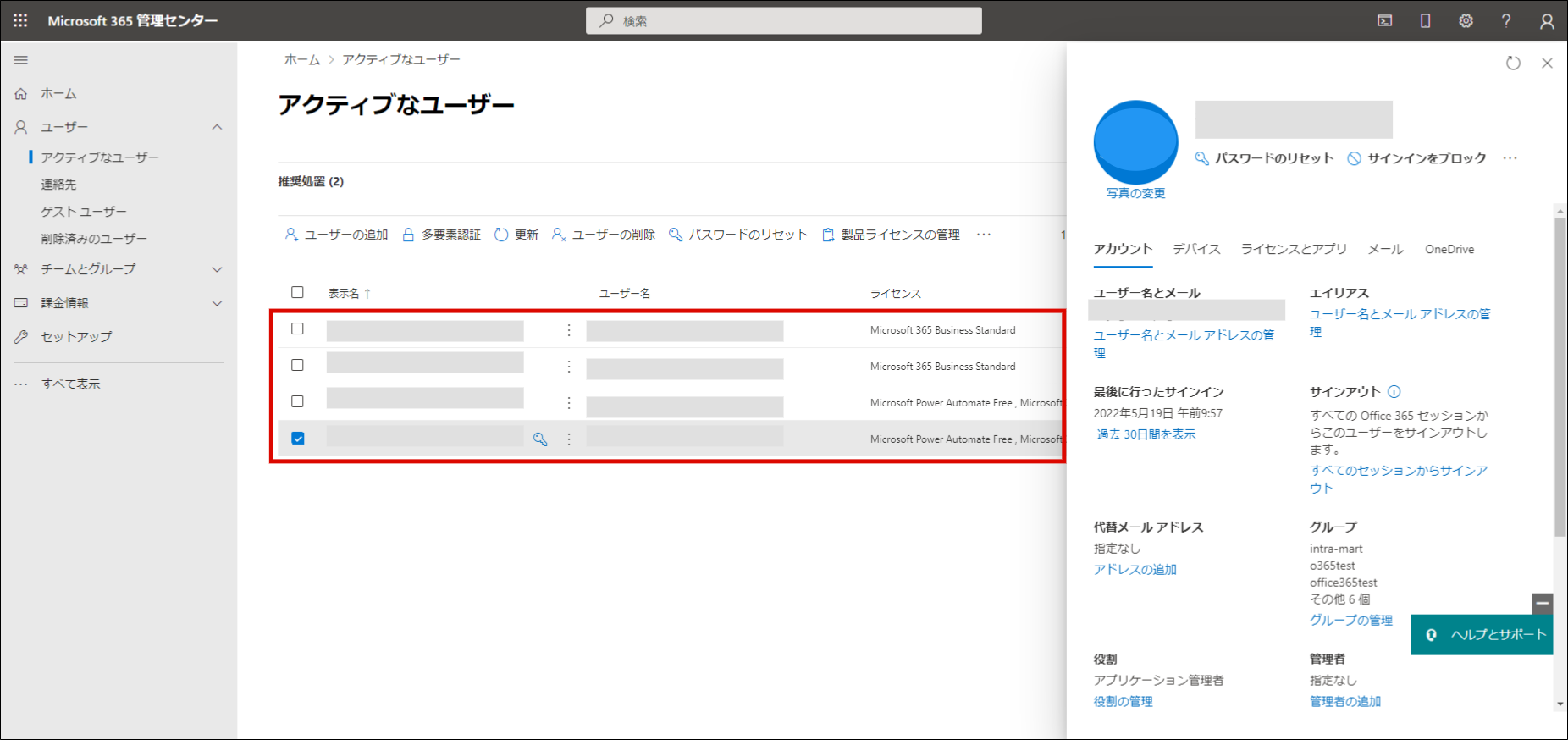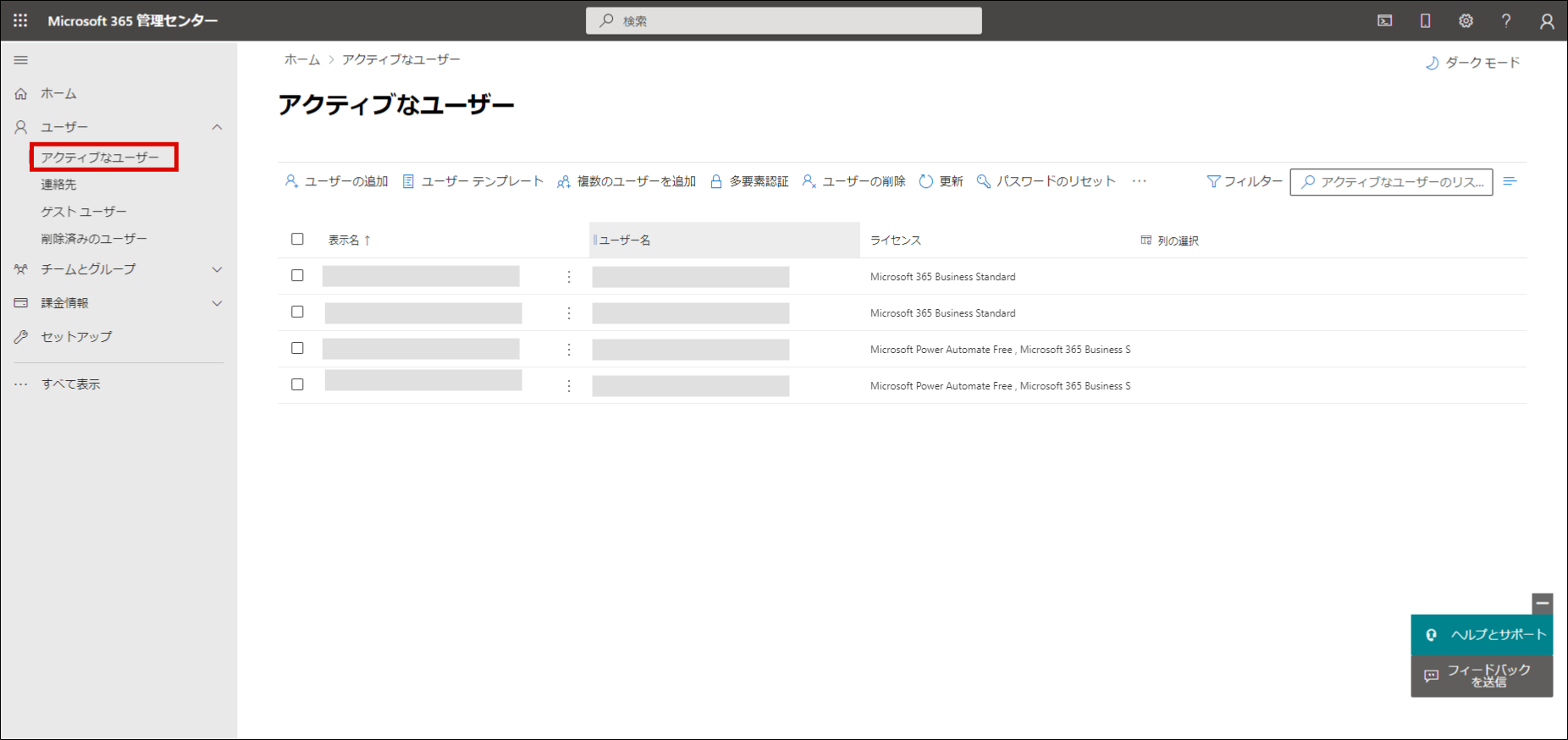 サイドメニュー「ユーザ」 - 「アクティブなユーザ」をクリックします。