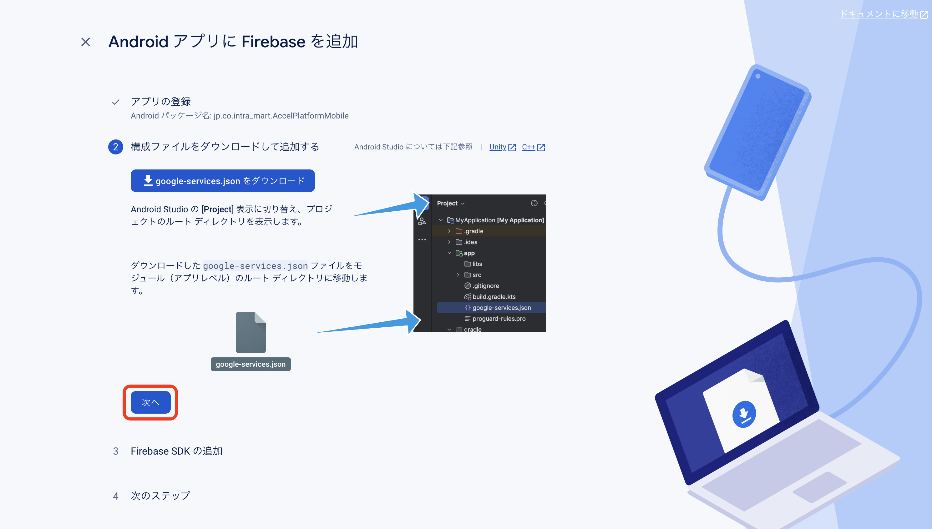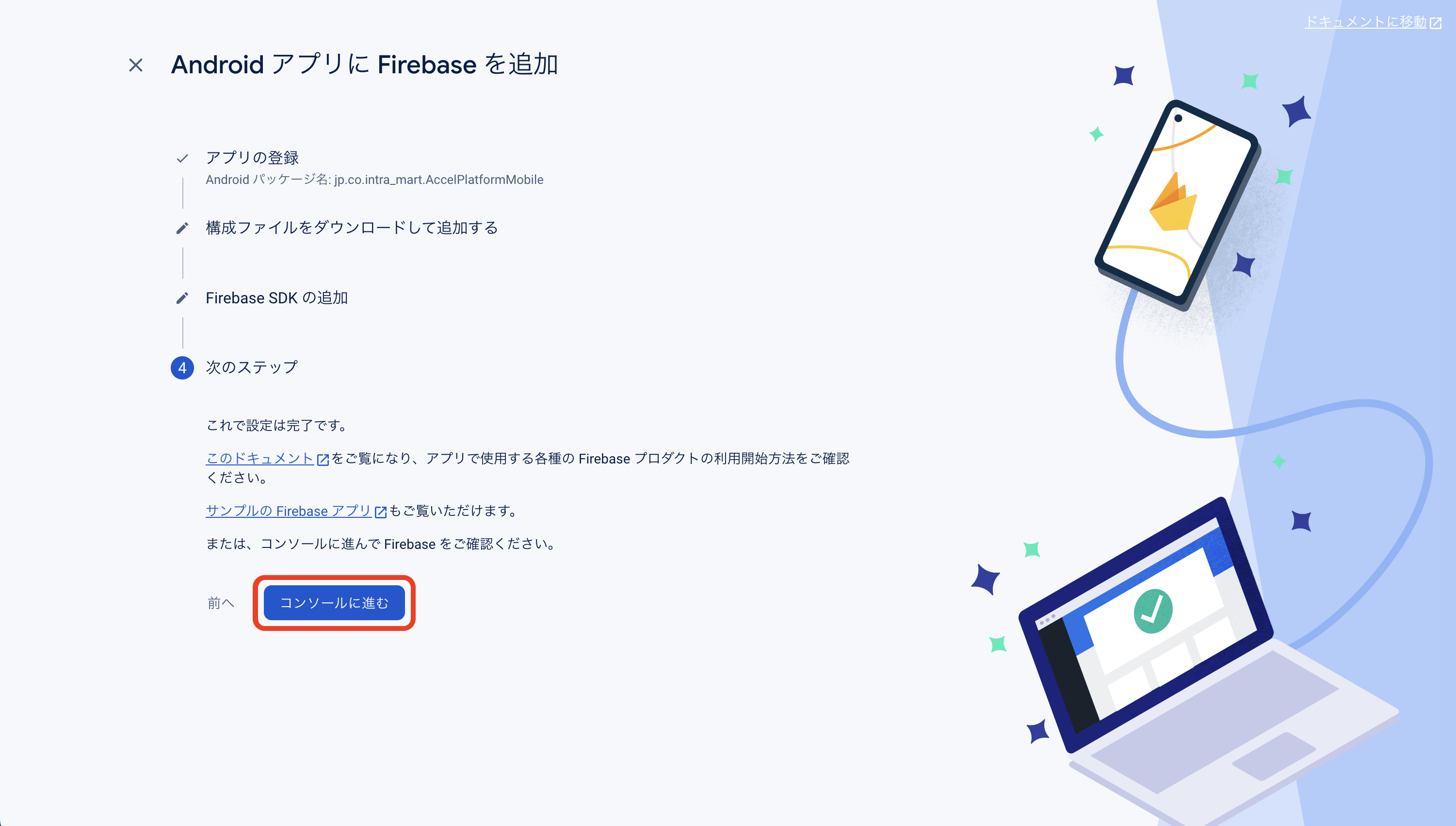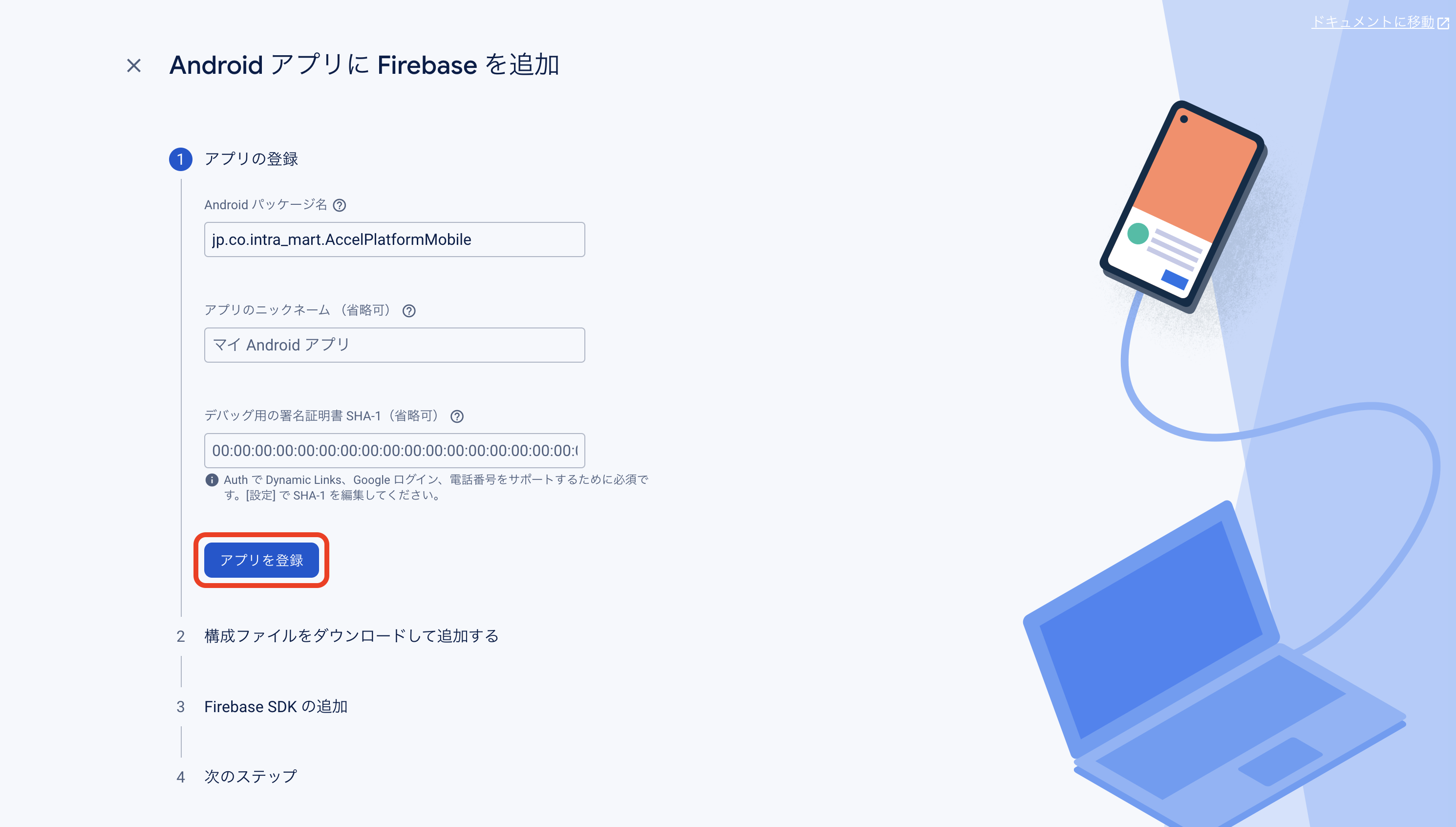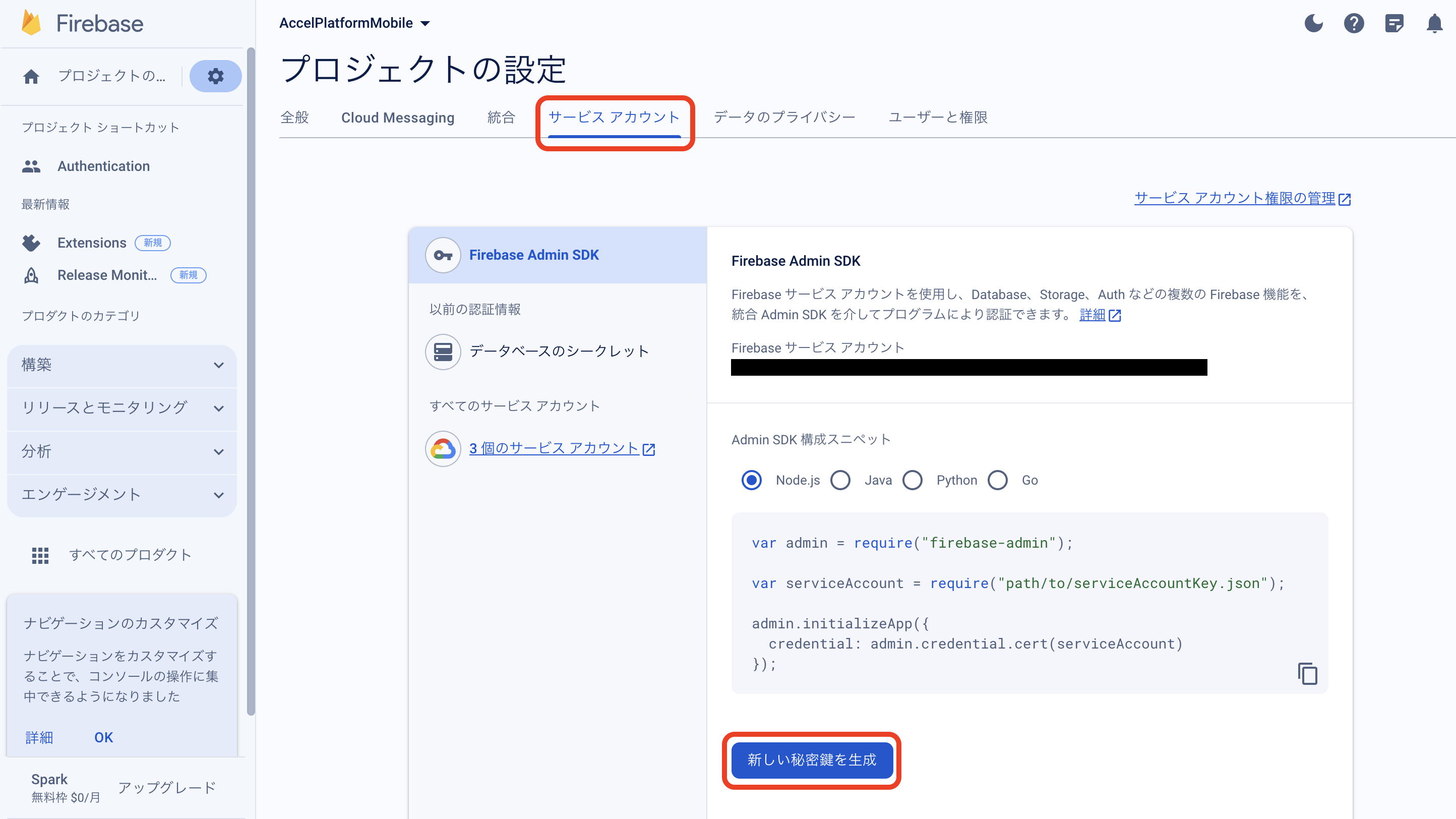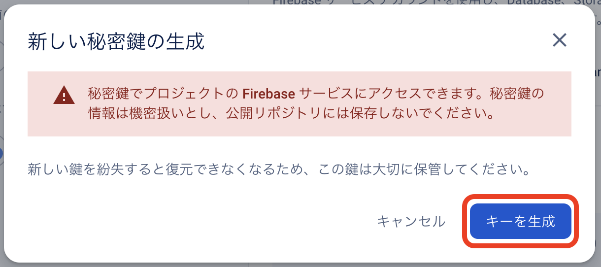 Firebase Console にログインしてください。 プロジェクトを作成します。 フォームに以下の内容を入力し、「続行」をクリックしてください。 「Googleアナリティクス」を無効にし、「プロジェクトの作成」をクリックしてください。(Googleアナリティクスを利用する場合は有効にして必要な設定をおこなってください。) プロジェクトの準備ができたら、「続行」をクリックしてください。 作成したプロジェクトをクリックしてください。 プロジェクトへAndroidアプリを追加します。「Androidアプリ追加」アイコンをクリックしてください。 フォームに以下の内容を入力し、「アプリを登録」をクリックしてください。 「次へ」をクリックし、4まで進めてください。 「コンソールに進む」をクリックしてください。 ウェブAPIキーを発行するために、Androidアプリにプロダクトを追加します。「Authentication」をクリックしてください。 「始める」をクリックしてください。 「ログイン方法」タブを選択し、ログイン プロバイダ「メール/パスワード」をクリックしてください。 「有効にする」をONに変更し、「保存」をクリックしてください。 サービスアカウントの秘密鍵を生成します。プロジェクト概要の歯車アイコンをクリックし、「プロジェクトを設定」をクリックしてください。 「サービスアカウント」タブを選択し、「新しい秘密鍵を生成」をクリックしてください。 表示されたメッセージを確認し、「キー生成」をクリックしてください。秘密鍵が生成されると、JSON 形式のサービスアカウントの認証情報ファイルがダウンロードされます。設定ファイルを編集する際に、設定ファイルと同じディレクトリに配置する必要がありますので、保持しておいてください。 全般タブを選択し、プロジェクトのプロジェクトID、ウェブAPIキーを確認します。設定ファイルを編集する際に必要な文字列ですので、控えておいてください。 マイアプリ - AndroidアプリのアプリIDを確認します。設定ファイルを編集する際に必要な文字列ですので、控えておいてください。 「Cloud Messaging」タブへ移動し、送信者IDを確認します。設定ファイルを編集する際に必要な文字列ですので、控えておいてください。