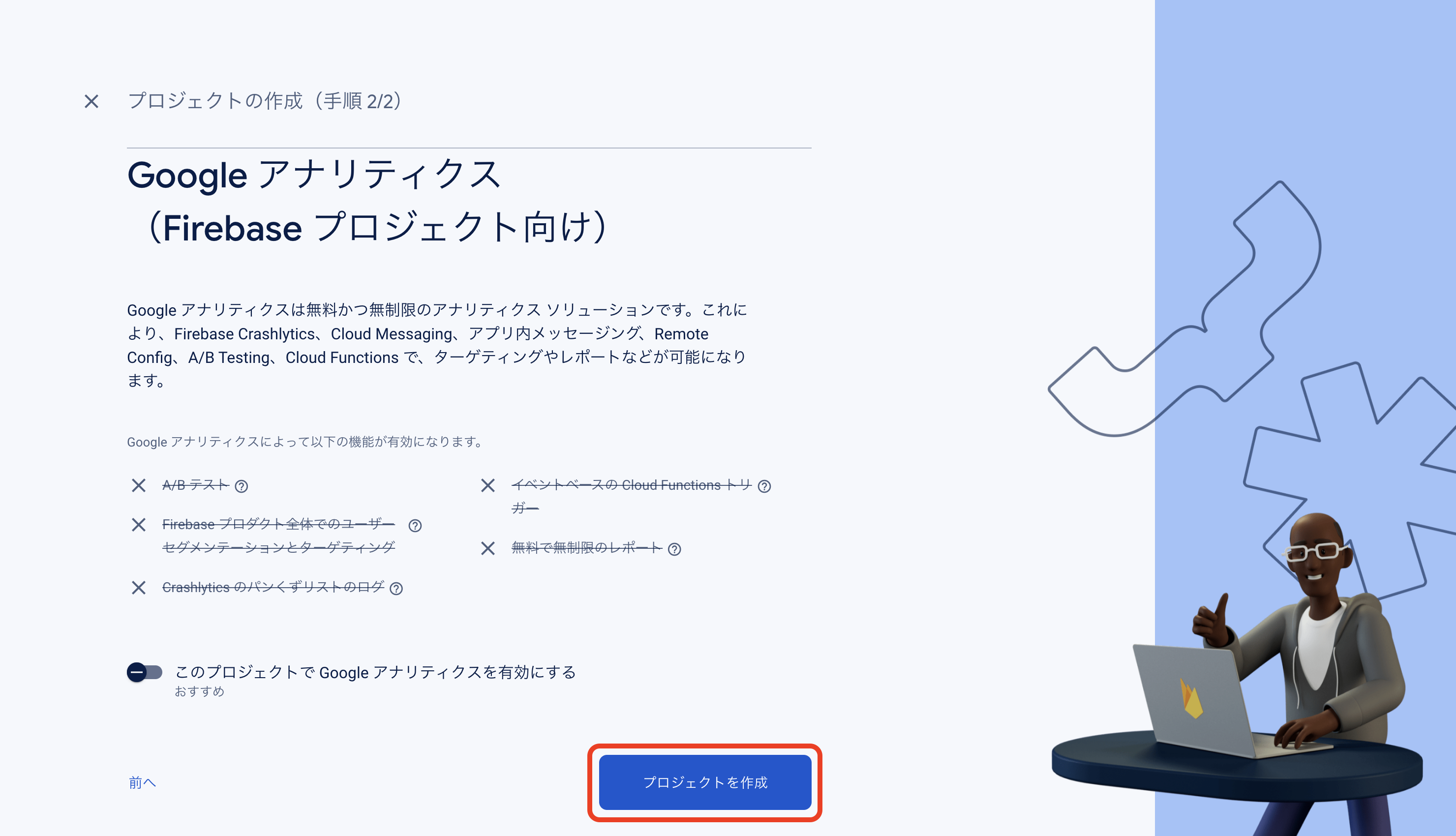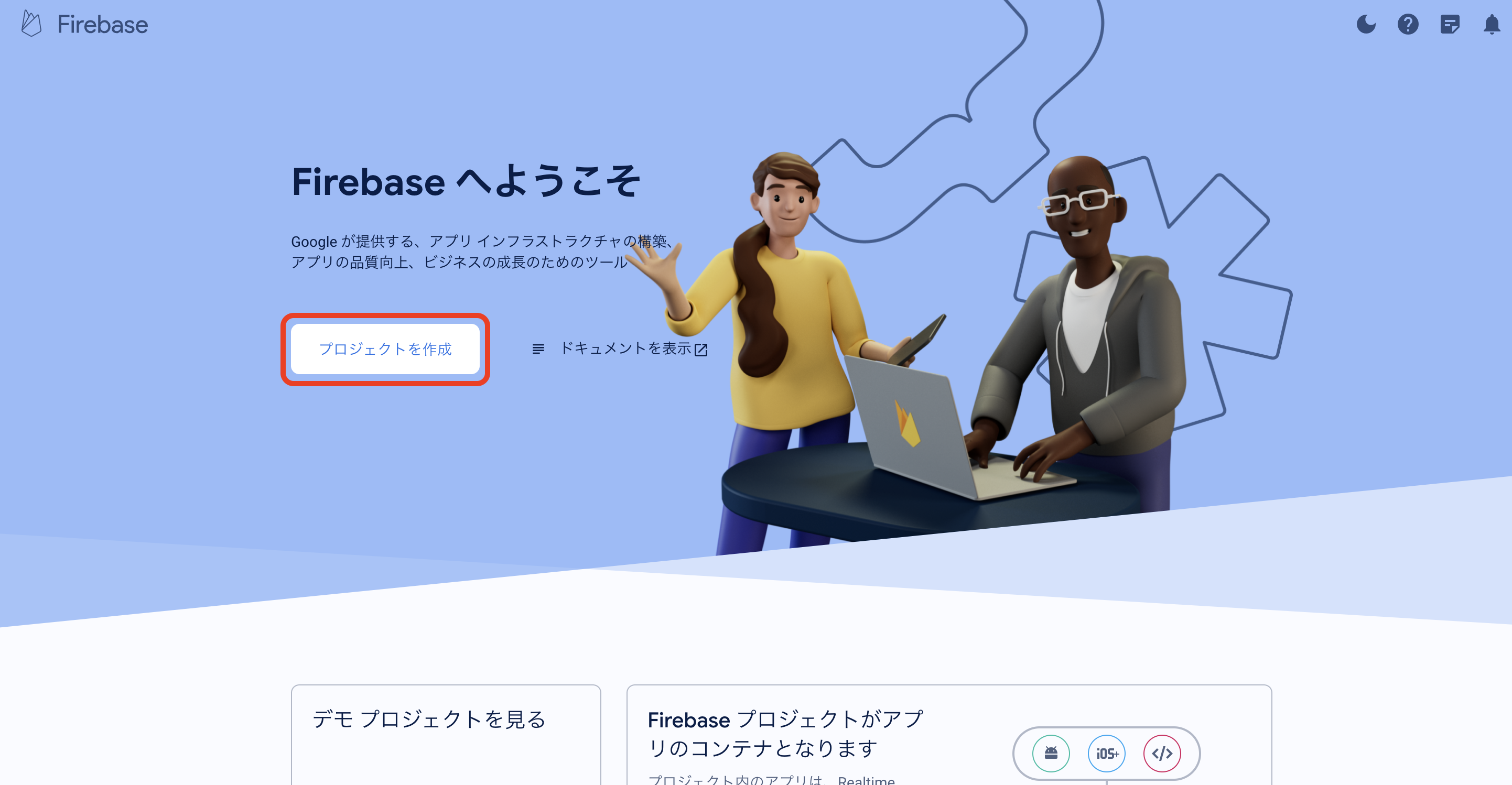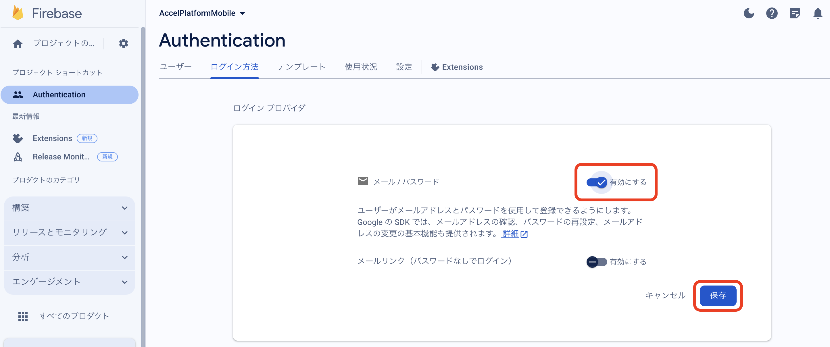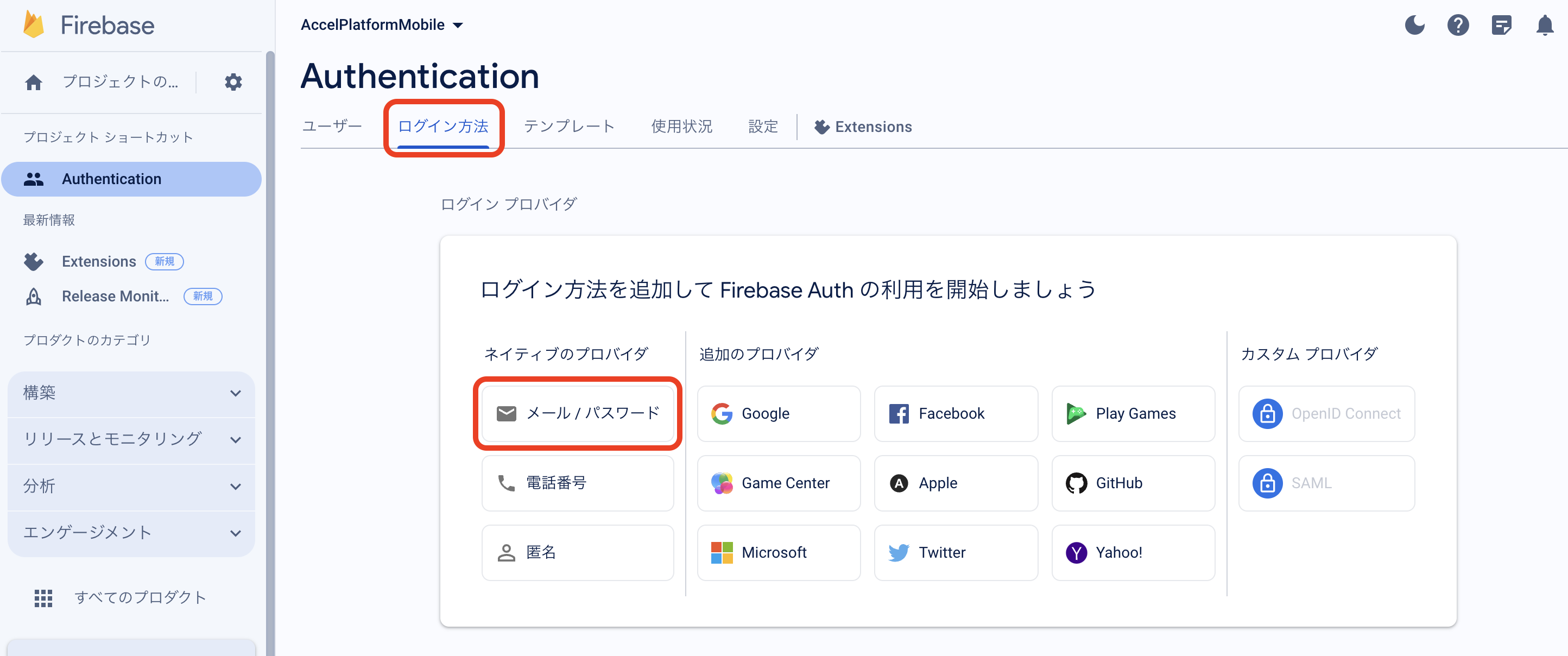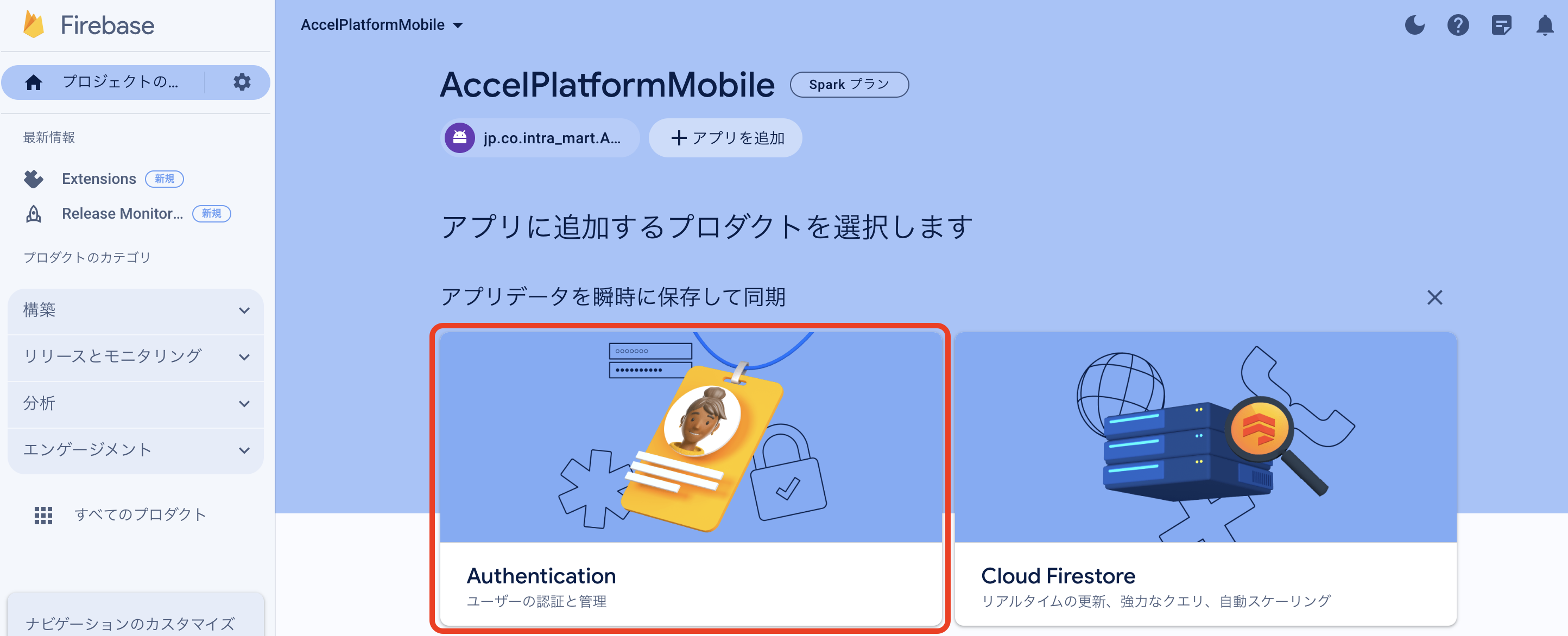 Firebase Console にログインしてください。 プロジェクトを作成します。 フォームに以下の内容を入力し、「続行」をクリックしてください。 「Googleアナリティクス」を無効にし、「プロジェクトの作成」をクリックしてください。(Googleアナリティクスを利用する場合は有効にして必要な設定をおこなってください。) プロジェクトの準備ができたら、「続行」をクリックしてください。 作成したプロジェクトをクリックしてください。 プロジェクトへAndroidアプリを追加します。「Androidアプリ追加」アイコンをクリックしてください。 フォームに以下の内容を入力し、「アプリを登録」をクリックしてください。 「次へ」をクリックし、4まで進めてください。 「コンソールに進む」をクリックしてください。 ウェブAPIキーを発行するために、Androidアプリにプロダクトを追加します。「Authentication」をクリックしてください。 「始める」をクリックしてください。 「ログイン方法」タブを選択し、ログイン プロバイダ「メール/パスワード」をクリックしてください。 「有効にする」をONに変更し、「保存」をクリックしてください。 サービスアカウントの秘密鍵を生成します。プロジェクト概要の歯車アイコンをクリックし、「プロジェクトを設定」をクリックしてください。 「サービスアカウント」タブを選択し、「新しい秘密鍵を生成」をクリックしてください。 表示されたメッセージを確認し、「キー生成」をクリックしてください。秘密鍵が生成されると、JSON 形式のサービスアカウントの認証情報ファイルがダウンロードされます。設定ファイルを編集する際に、設定ファイルと同じディレクトリに配置する必要がありますので、保持しておいてください。 全般タブを選択し、プロジェクトのプロジェクトID、ウェブAPIキーを確認します。設定ファイルを編集する際に必要な文字列ですので、控えておいてください。 マイアプリ - AndroidアプリのアプリIDを確認します。設定ファイルを編集する際に必要な文字列ですので、控えておいてください。 「Cloud Messaging」タブへ移動し、送信者IDを確認します。設定ファイルを編集する際に必要な文字列ですので、控えておいてください。