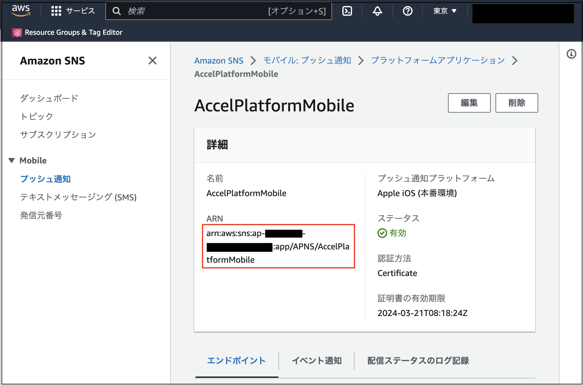 Endpointは AWS documentation - Regions and Endpoints で確認できます。リージョンが「Asia Pacific (Tokyo)」の場合、Endpoint は「sns.ap-northeast-1.amazonaws.com」です。