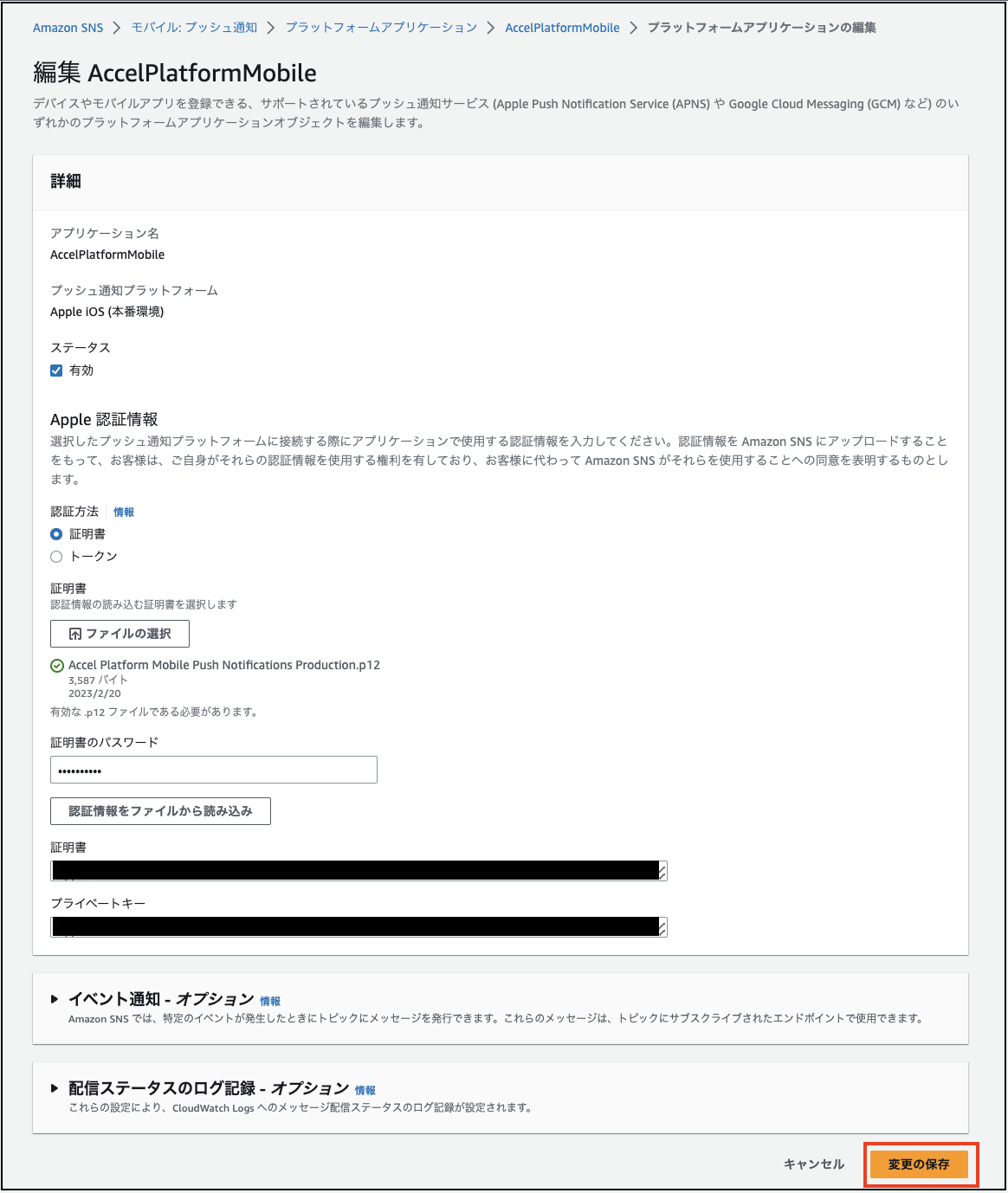 Amazon SNSにサインインしてください。 リージョンを選択してください。 サービスを選択してください。 「Mobile」ー「プッシュ通知」からアプリケーションを選択し、「編集」をクリックします。 フォームに以下の内容を入力し、「変更の保存」をクリックしてください。