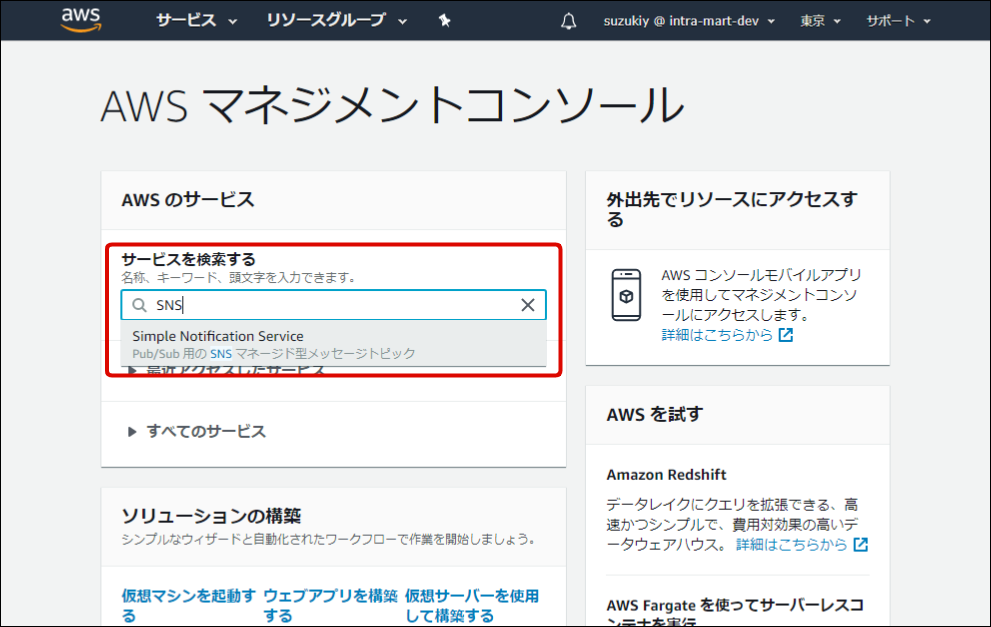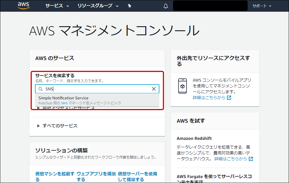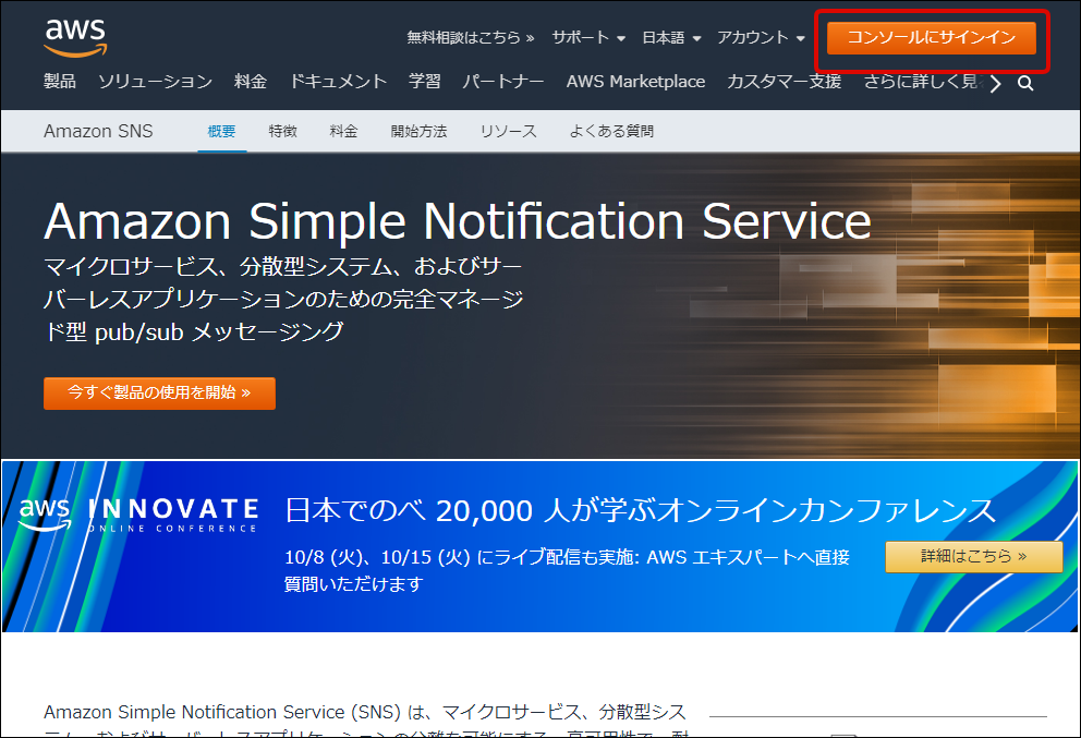 Amazon SNSの設定を行います。