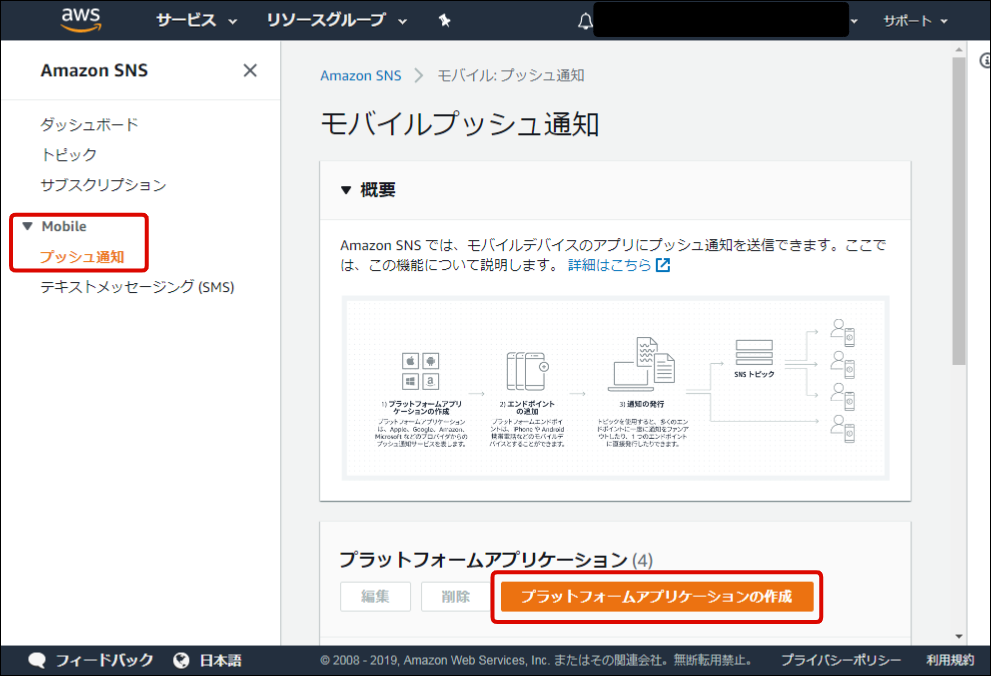 モバイル通知機能を使用するための設定を行います。 iOSへの通知を行うには、Amazon SNSを使用します。