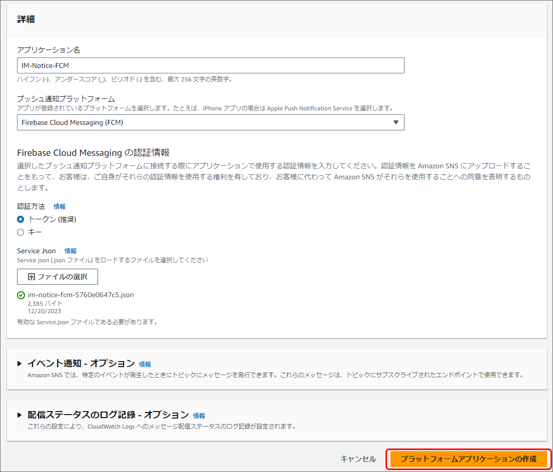 項目 説明 アプリケーション名 任意の名前を入力します。 プッシュ通知プラットフォーム 「Firebase Cloud Messaging(FCM)」を選択します。 認証方法 「トークン (推奨)」を選択します。 Service Json FCM の設定 でダウンロードした JSON 形式のサービスアカウントの認証情報ファイルを選択します。 アプリケーションが追加されました。「ARN」を確認します。設定ファイルを編集する際に必要な文字列ですので、控えておいてください。