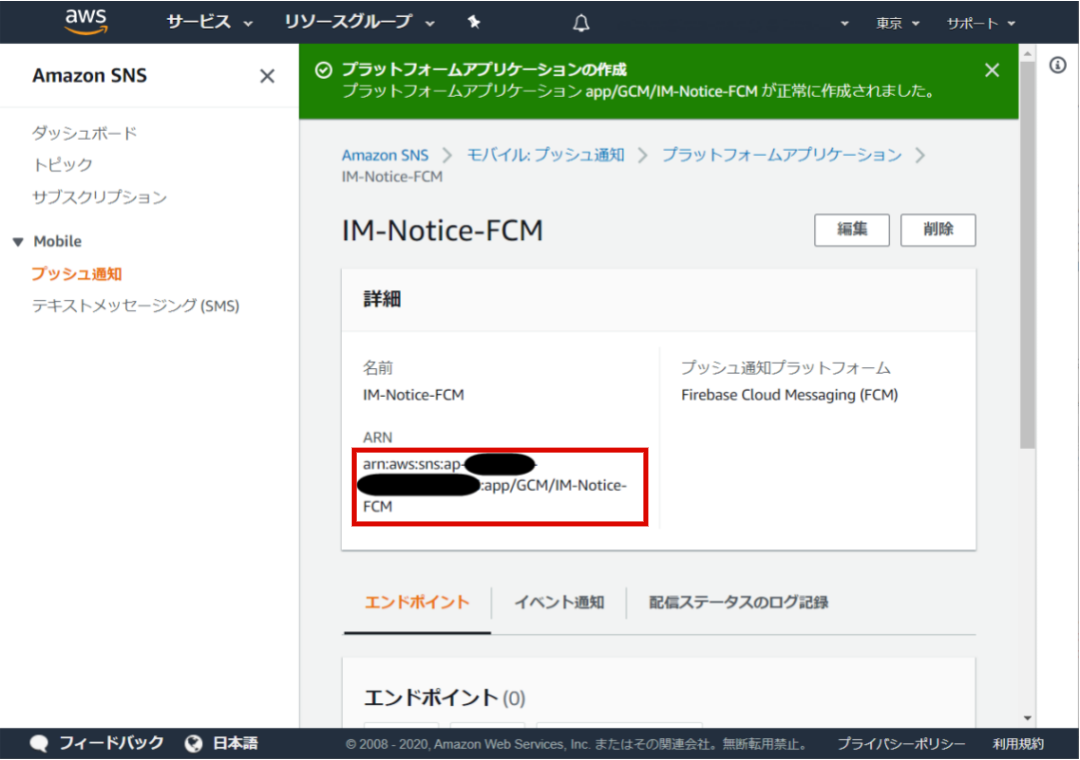 Endpointは AWS documentation - Regions and Endpoints で確認できます。リージョンが「Asia Pacific (Tokyo)」の場合、Endpointは「sns.ap-northeast-1.amazonaws.com」です。