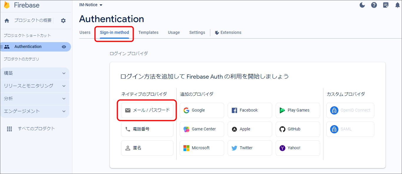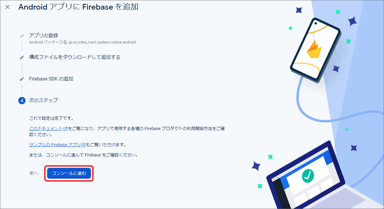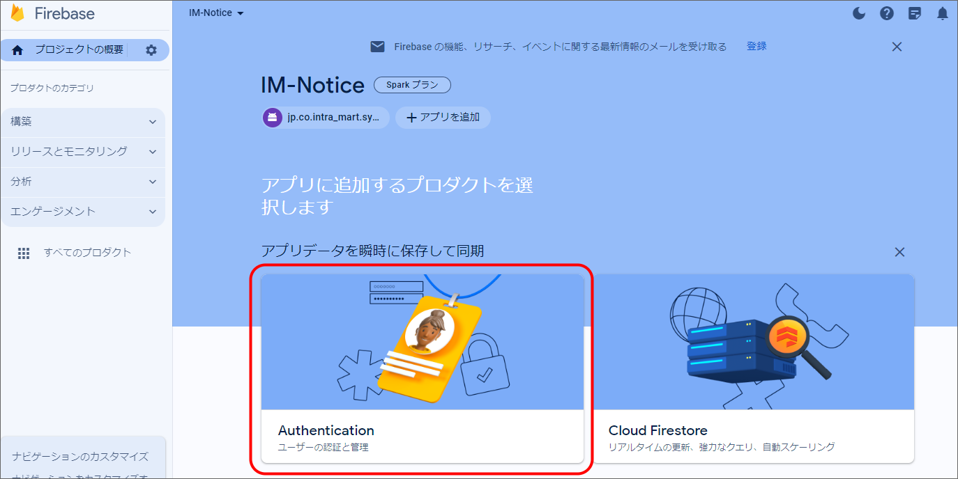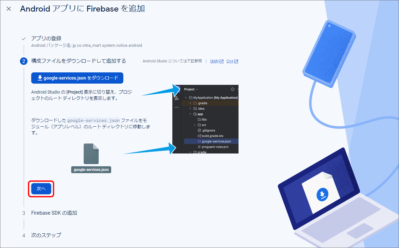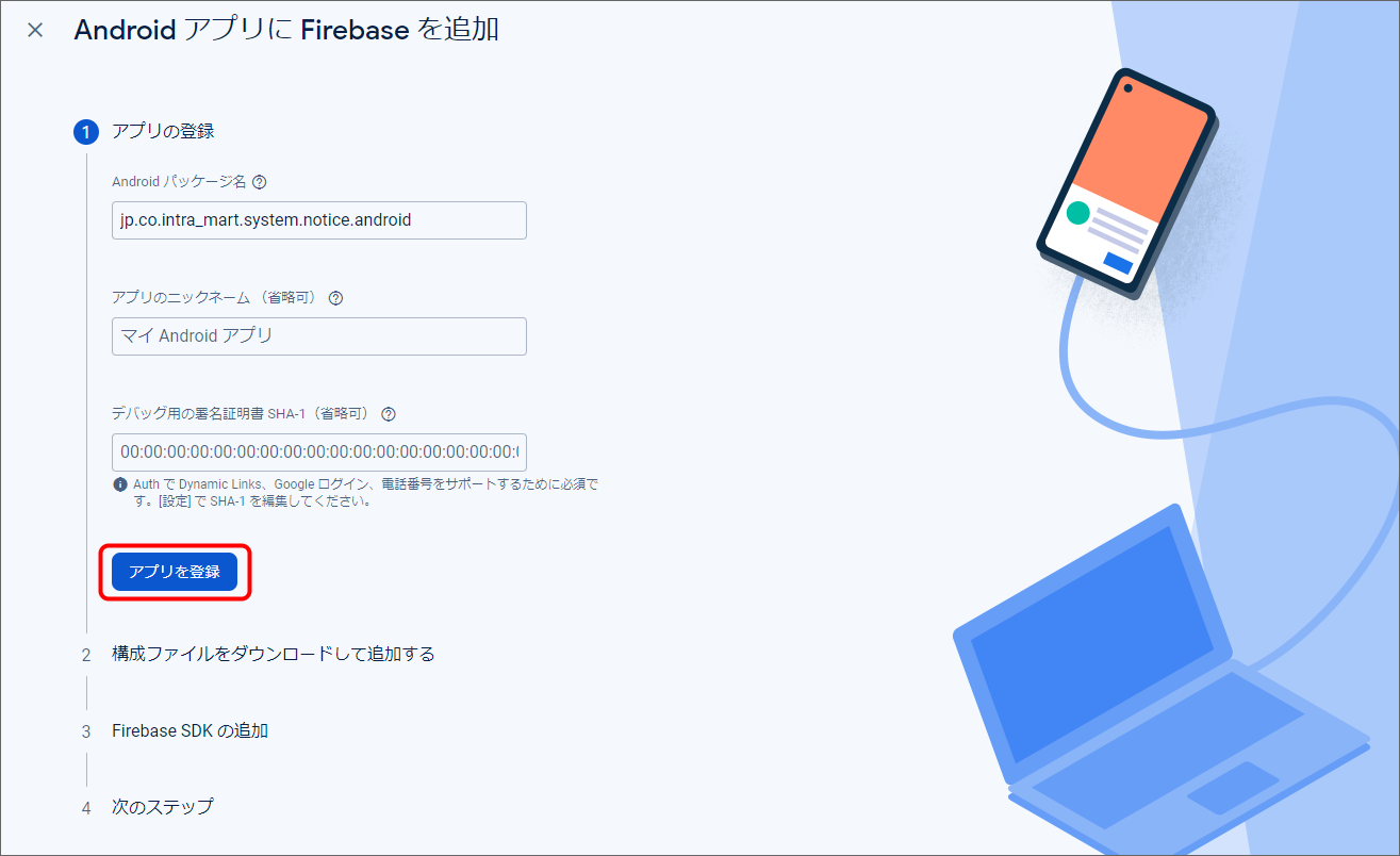 Firebase Console にログインしてください。 プロジェクトを作成します。 フォームに以下の内容を入力し、「続行」をクリックしてください。 「Googleアナリティクス」を無効にし、「プロジェクトの作成」をクリックしてください。(Googleアナリティクスを利用する場合は有効にして必要な設定をおこなってください。) プロジェクトの準備ができたら、「続行」をクリックしてください。 作成したプロジェクトをクリックしてください。 プロジェクトへAndroidアプリを追加します。「Androidアプリ追加」アイコンをクリックしてください。 フォームに以下の内容を入力し、「アプリを登録」をクリックしてください。 「次へ」をクリックし、4まで進めてください。 「コンソールに進む」をクリックしてください。 ウェブAPIキーを発行するために、Androidアプリにプロダクトを追加します。「Authentication」をクリックしてください。 「始める」をクリックしてください。 「Sign-in method」タブを選択し、ログイン プロバイダ「メール/パスワード」をクリックしてください。 「有効にする」をONに変更し、「保存」をクリックしてください。 サービスアカウントの秘密鍵を生成します。プロジェクト概要の歯車アイコンをクリックし、「プロジェクトを設定」をクリックしてください。 「サービスアカウント」タブを選択し、「新しい秘密鍵を生成」をクリックしてください。 表示されたメッセージを確認し、「キー生成」をクリックしてください。秘密鍵が生成されると、JSON 形式のサービスアカウントの認証情報ファイルがダウンロードされます。設定ファイルを編集する際に、設定ファイルと同じディレクトリに配置する必要がありますので、保持しておいてください。 全般タブを選択し、プロジェクトのプロジェクトID、ウェブAPIキーを確認します。設定ファイルを編集する際に必要な文字列ですので、控えておいてください。 マイアプリ - AndroidアプリのアプリIDを確認します。設定ファイルを編集する際に必要な文字列ですので、控えておいてください。 クラウドメッセージングタブへ移動し、送信者IDを確認します。設定ファイルを編集する際に必要な文字列ですので、控えておいてください。