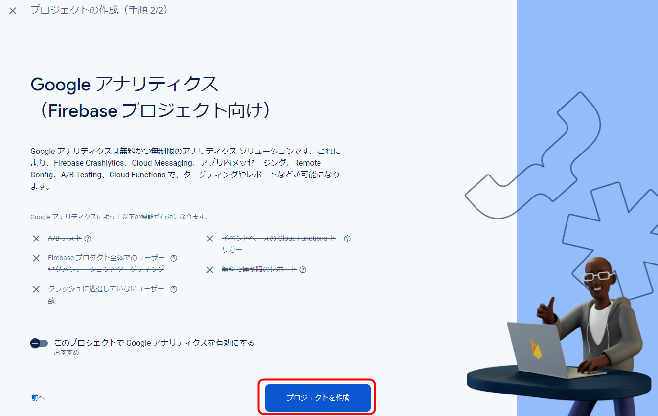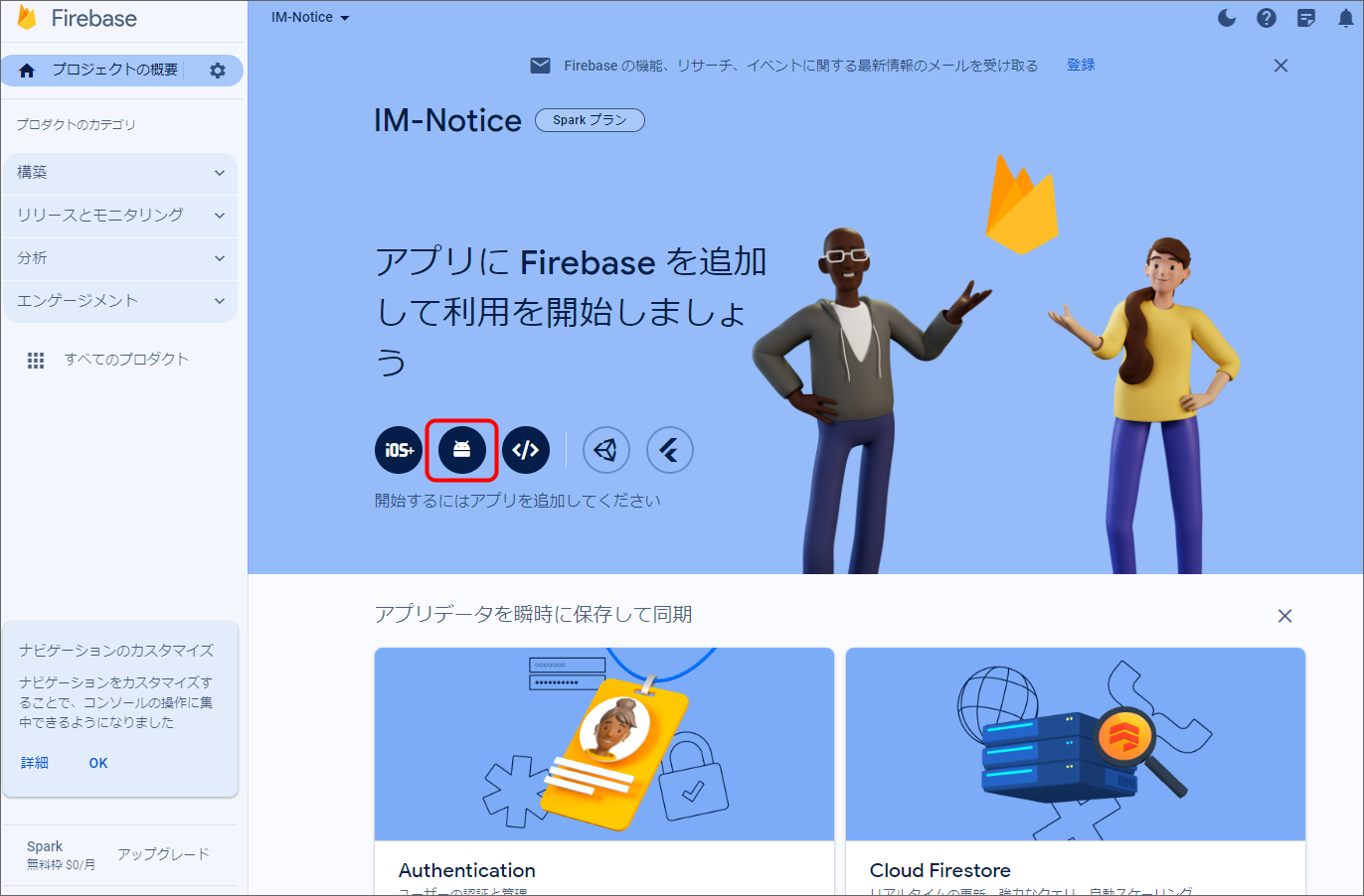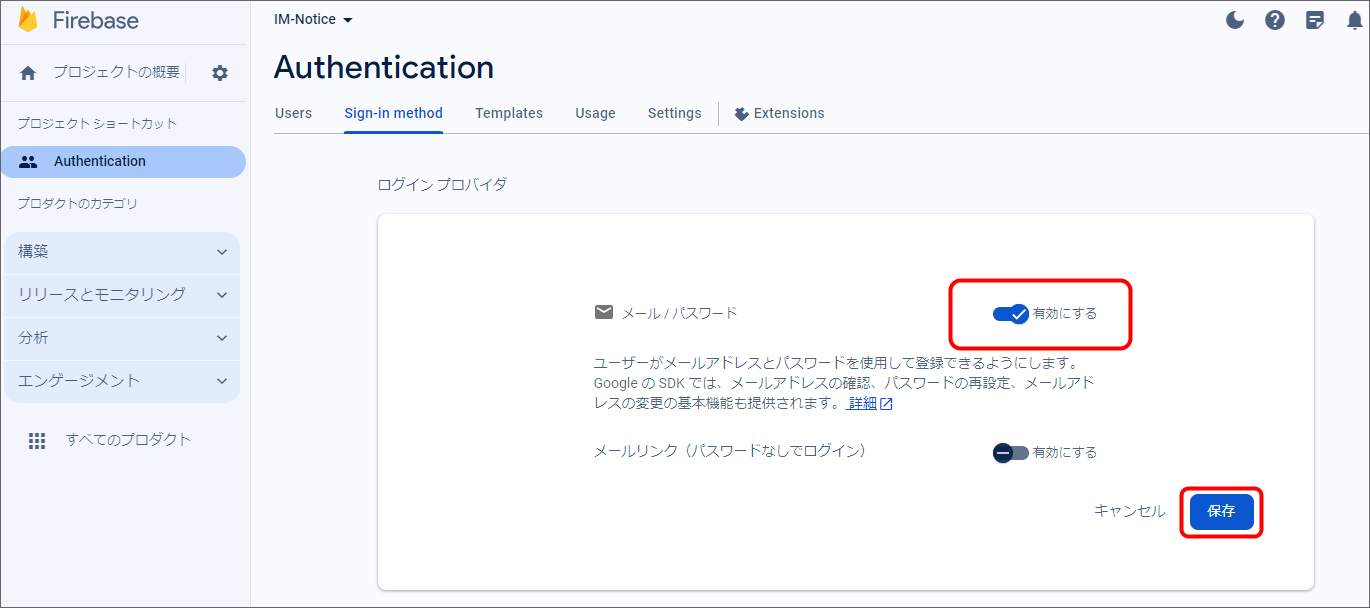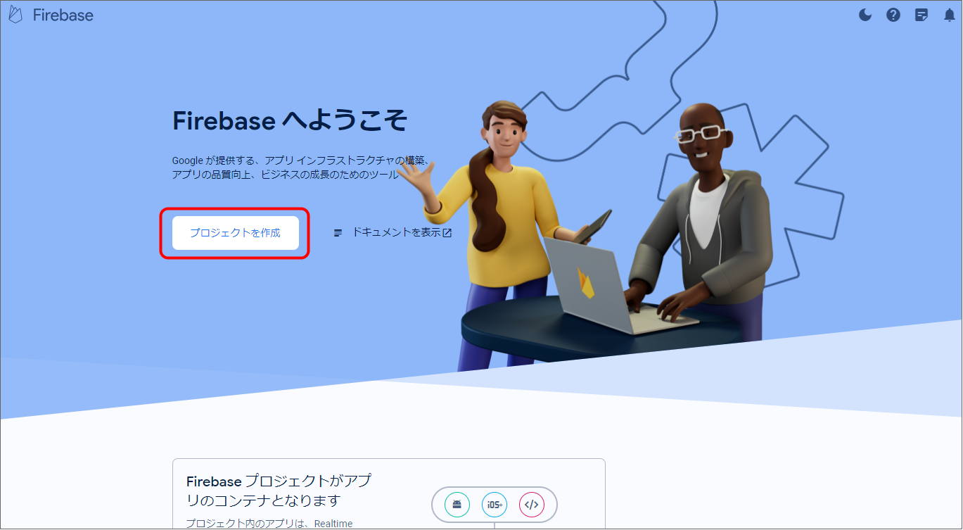 Firebase Console にログインしてください。 プロジェクトを作成します。 フォームに以下の内容を入力し、「続行」をクリックしてください。 「Googleアナリティクス」を無効にし、「プロジェクトの作成」をクリックしてください。(Googleアナリティクスを利用する場合は有効にして必要な設定をおこなってください。) プロジェクトの準備ができたら、「続行」をクリックしてください。 作成したプロジェクトをクリックしてください。 プロジェクトへAndroidアプリを追加します。「Androidアプリ追加」アイコンをクリックしてください。 フォームに以下の内容を入力し、「アプリを登録」をクリックしてください。 「次へ」をクリックし、4まで進めてください。 「コンソールに進む」をクリックしてください。 ウェブAPIキーを発行するために、Androidアプリにプロダクトを追加します。「Authentication」をクリックしてください。 「始める」をクリックしてください。 「Sign-in method」タブを選択し、ログイン プロバイダ「メール/パスワード」をクリックしてください。 「有効にする」をONに変更し、「保存」をクリックしてください。 サービスアカウントの秘密鍵を生成します。プロジェクト概要の歯車アイコンをクリックし、「プロジェクトを設定」をクリックしてください。 「サービスアカウント」タブを選択し、「新しい秘密鍵を生成」をクリックしてください。 表示されたメッセージを確認し、「キー生成」をクリックしてください。秘密鍵が生成されると、JSON 形式のサービスアカウントの認証情報ファイルがダウンロードされます。設定ファイルを編集する際に、設定ファイルと同じディレクトリに配置する必要がありますので、保持しておいてください。 全般タブを選択し、プロジェクトのプロジェクトID、ウェブAPIキーを確認します。設定ファイルを編集する際に必要な文字列ですので、控えておいてください。 マイアプリ - AndroidアプリのアプリIDを確認します。設定ファイルを編集する際に必要な文字列ですので、控えておいてください。 クラウドメッセージングタブへ移動し、送信者IDを確認します。設定ファイルを編集する際に必要な文字列ですので、控えておいてください。