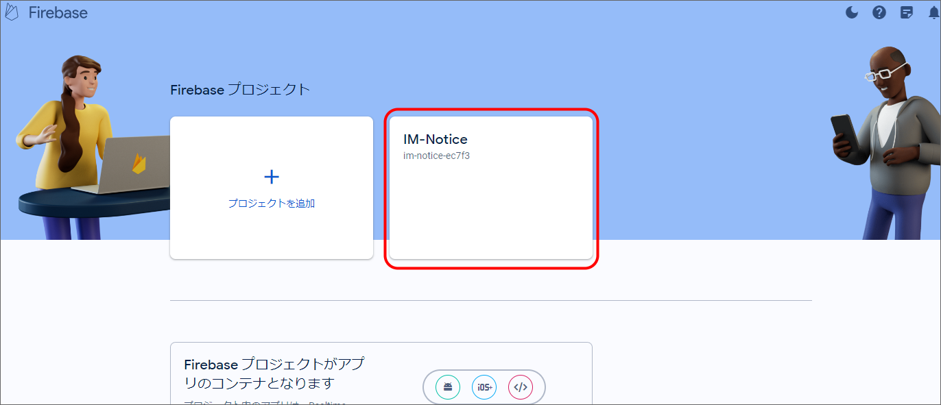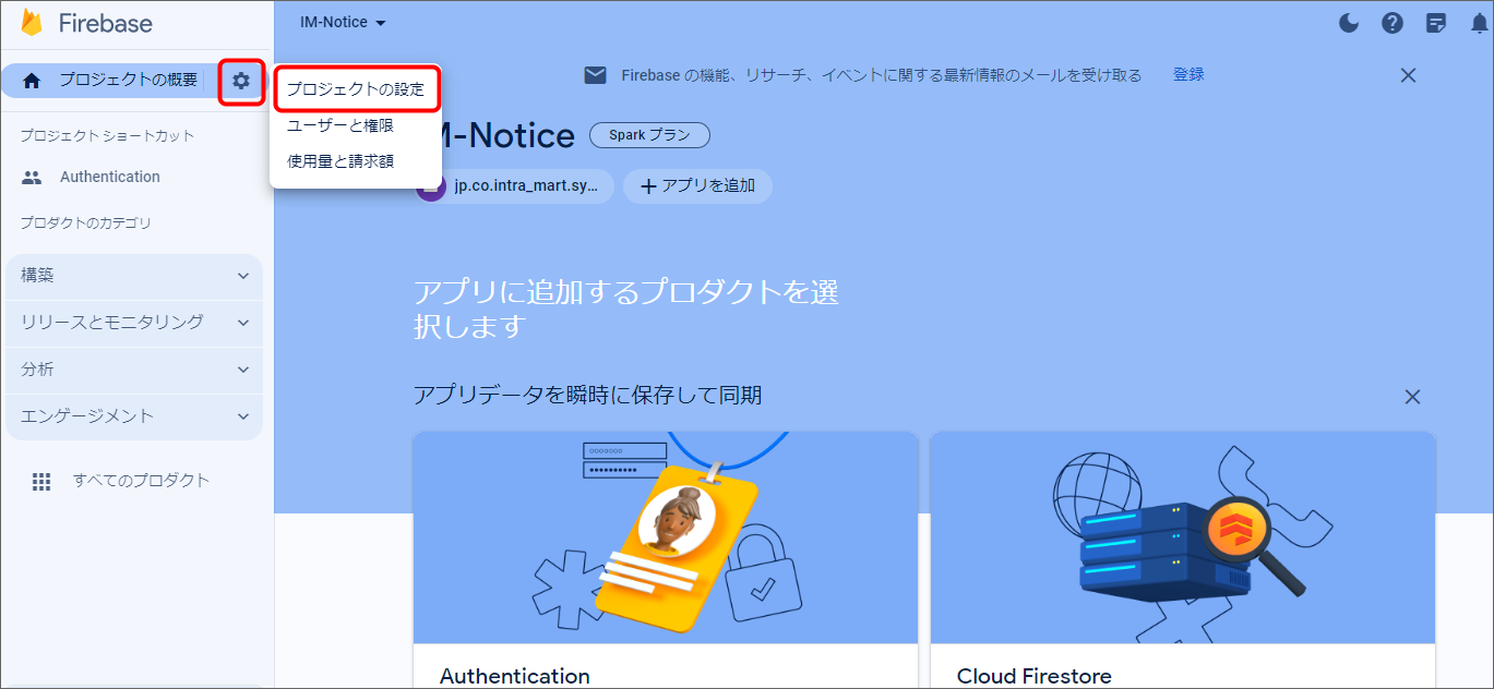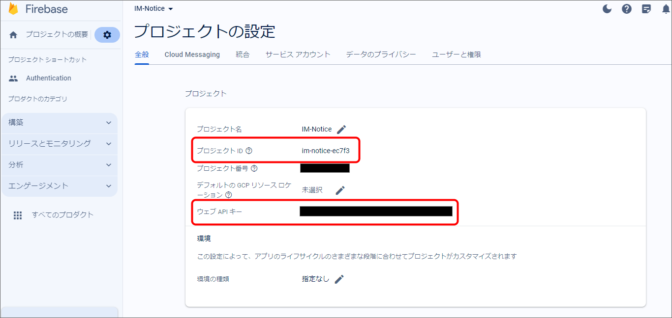 プロジェクトID等Firebase設定情報の確認方法は、 FCMの設定 を参照してください。