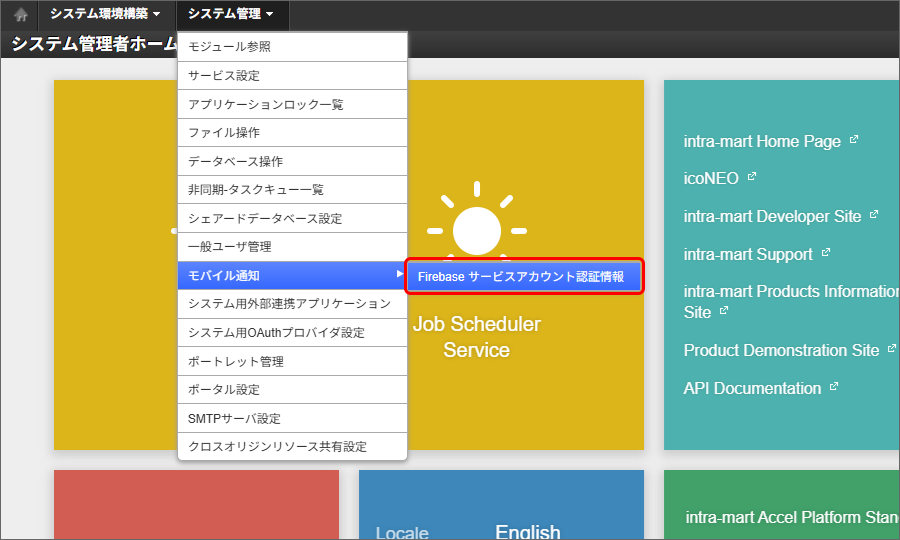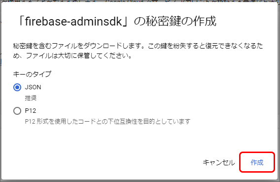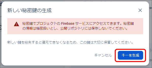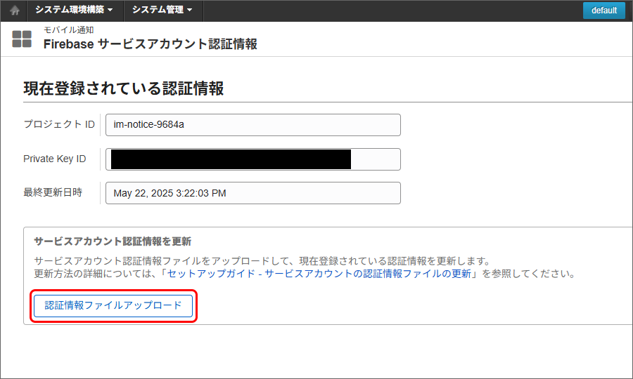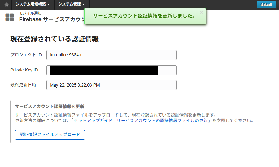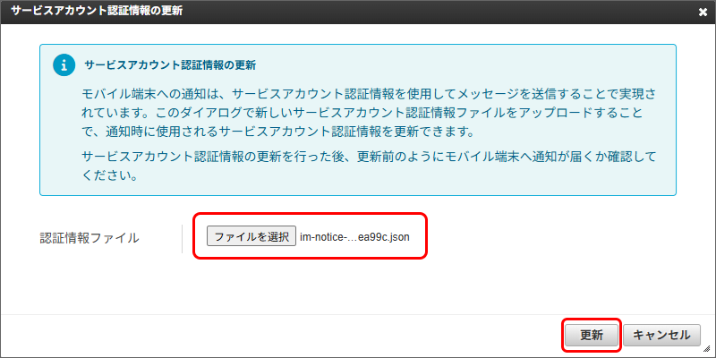サービスアカウントの新しい秘密鍵を作成します。Firebase Console にログインしてください。 対象のプロジェクトをクリックしてください。 プロジェクト概要の歯車アイコンをクリックし、「プロジェクトを設定」をクリックしてください。 「サービスアカウント」タブを選択し、「サービスアカウント権限の管理」をクリックしてください。 「firebase-adminsdk」という名前のアカウントの行の縦三点リーダー「⋮」をクリックし、「鍵を管理」をクリックしてください。 「鍵を追加」をクリックし、「新しい鍵を作成」をクリックしてください。 「作成」をクリックしてください。秘密鍵が生成されると、JSON 形式のサービスアカウントの認証情報ファイルがダウンロードされます。このファイルは、intra-mart Accel Platform にアップロードする必要がありますので、保持しておいてください。 サービスアカウントの認証情報ファイルを intra-mart Accel Platform にアップロードすることで、認証情報を更新できます。intra-mart Accel Platform にシステム管理者でログインしてください。 「システム管理」→「モバイル通知」→「Firebase サービスアカウント認証情報」をクリックしてください。 認証情報ファイルアップロードをクリックしてください。 サービスアカウントの認証情報ファイルを選択し、更新をクリックしてください。 更新確認ダイアログで決定をクリックすると更新できます。