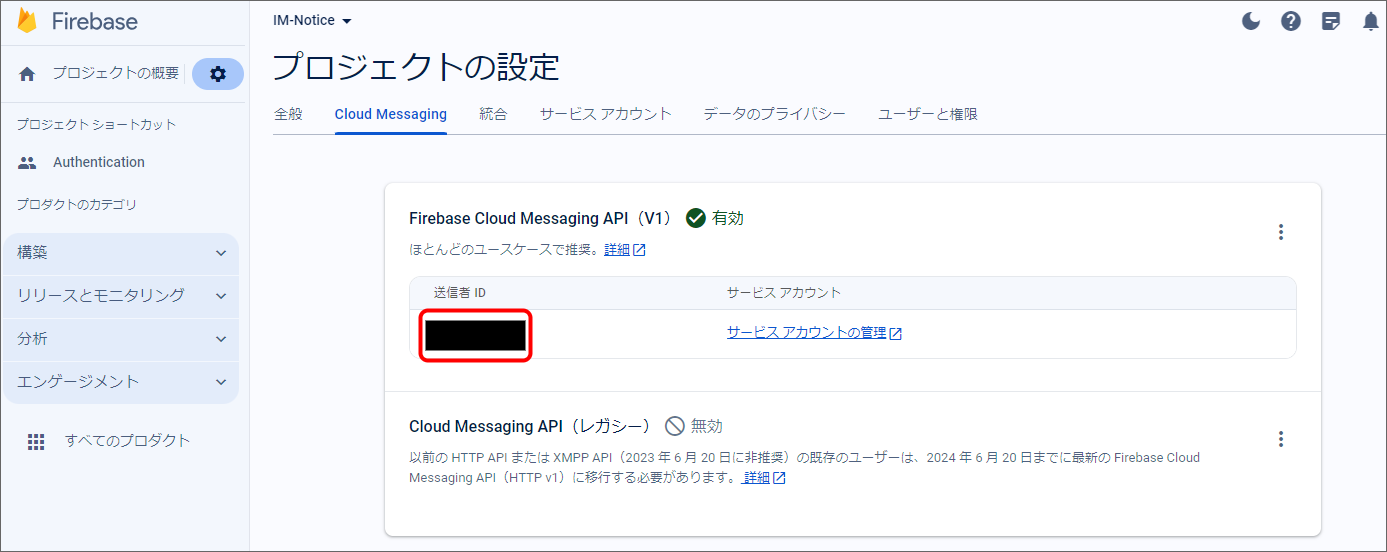 - Firebase クラウドメッセージングの送信者IDを設定してください。